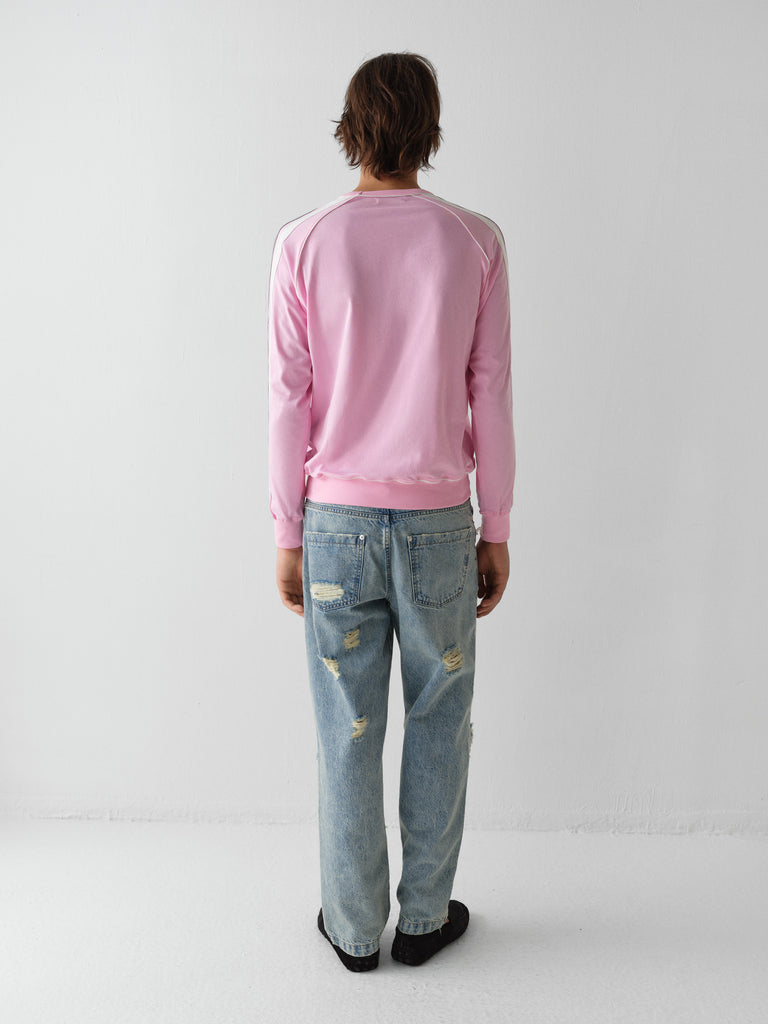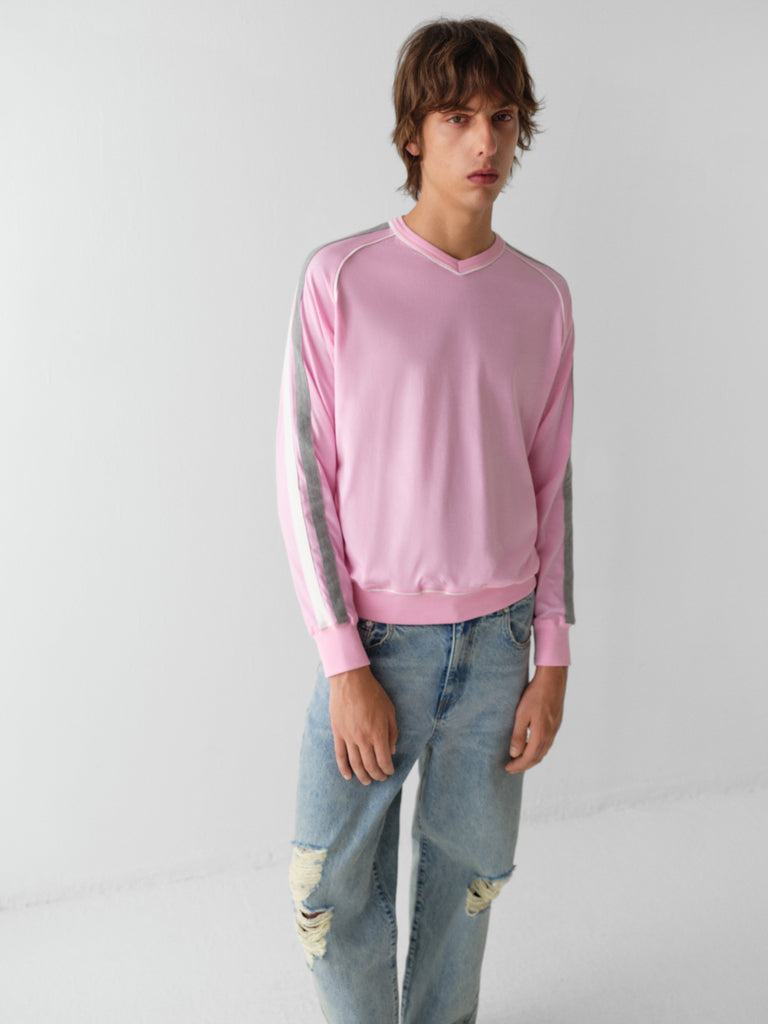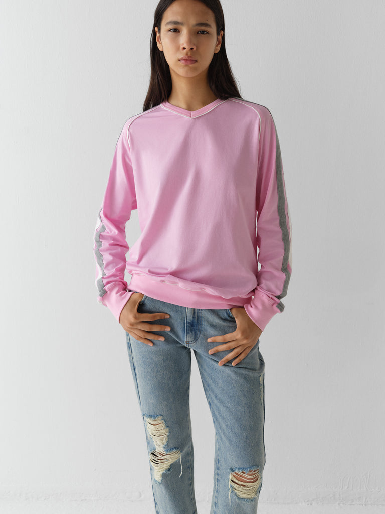 Pink long-sleeve t-shirt with grey and white strap detail.