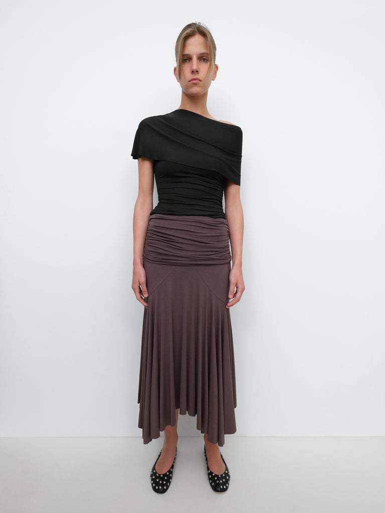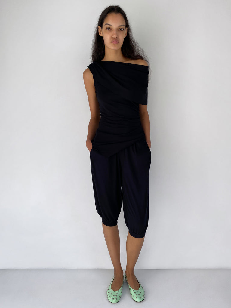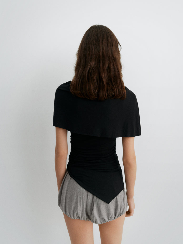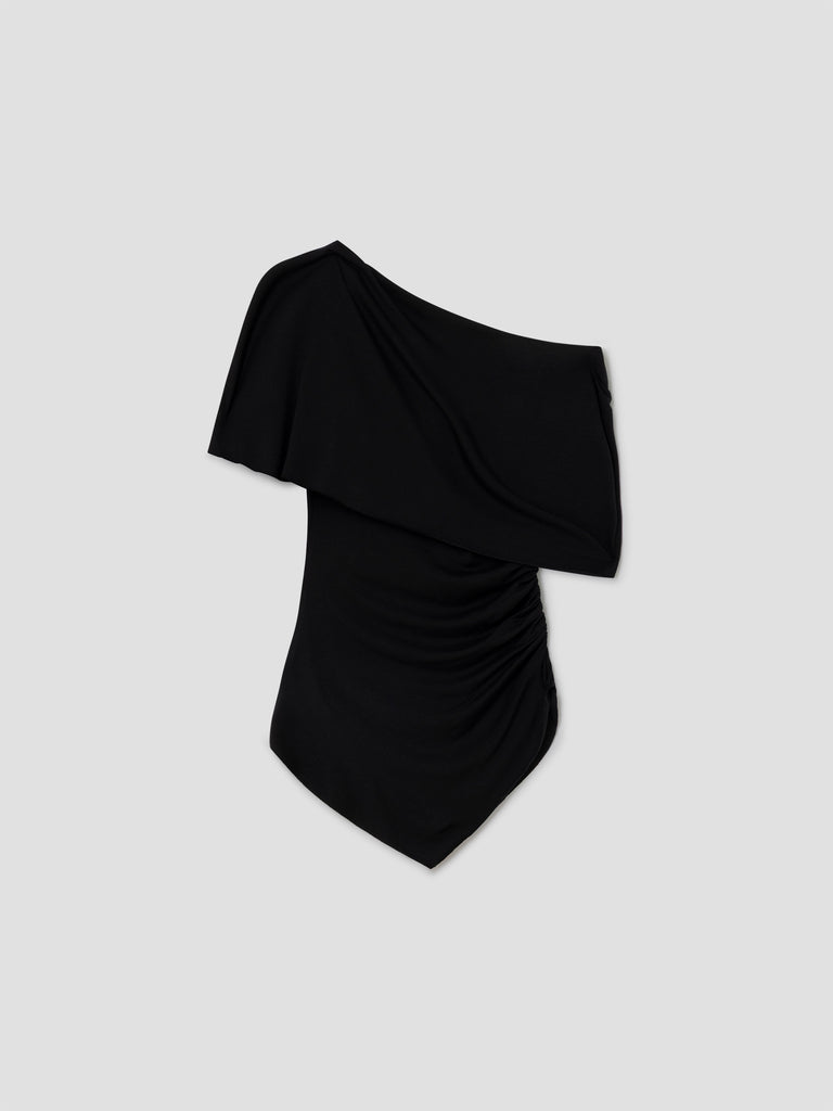 Black asymmetric draped women's top crafted in soft stretch jersey.