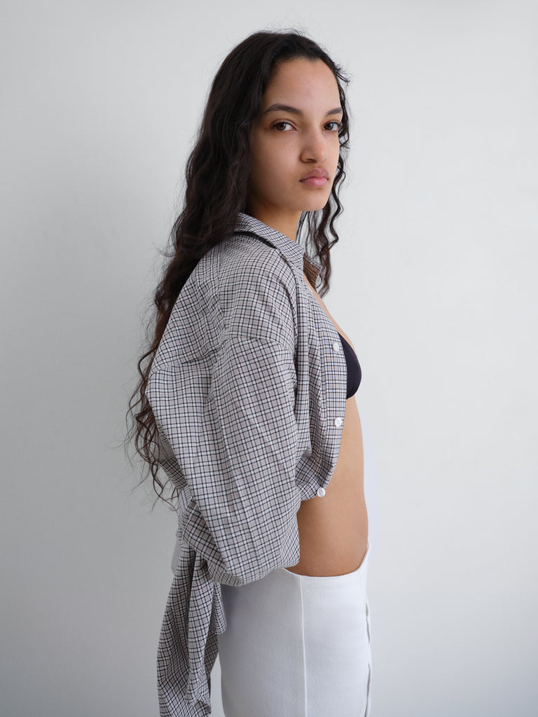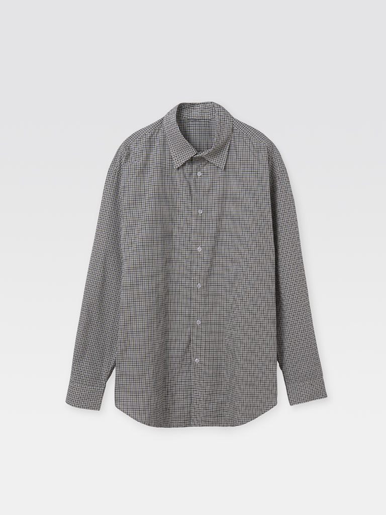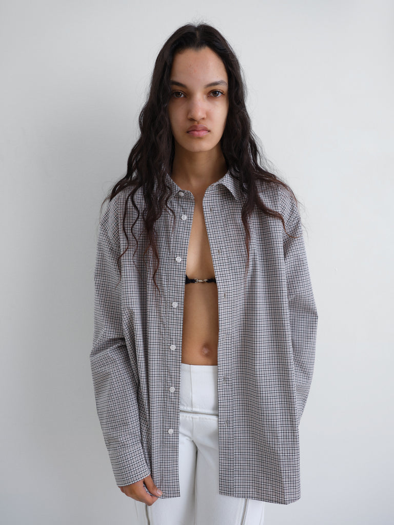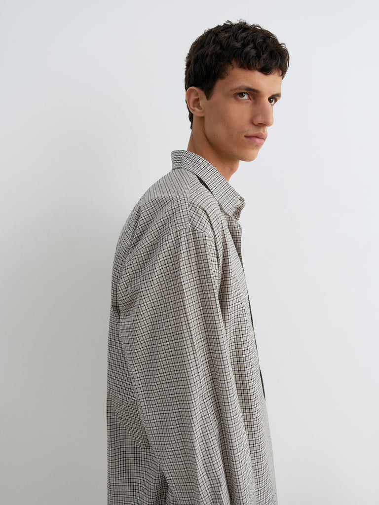 Grey oversized checkered shirt. Designed for women and men in lightweight fabric with a structured collar and front button placket. Features long sleeves with buttoned cuffs.