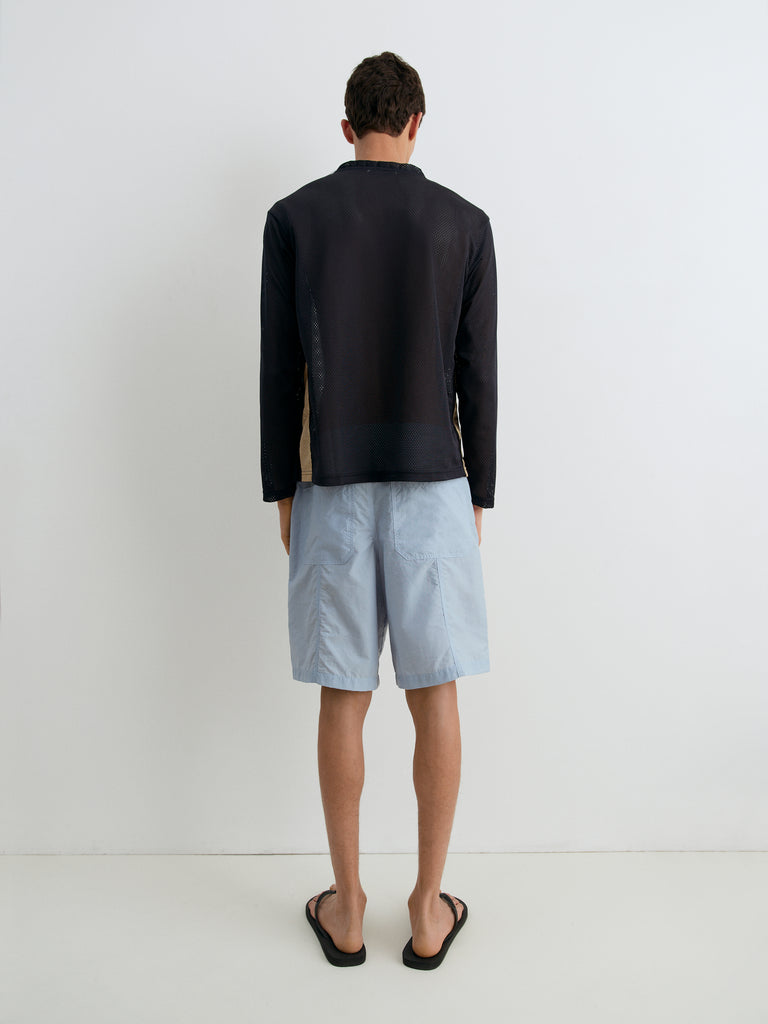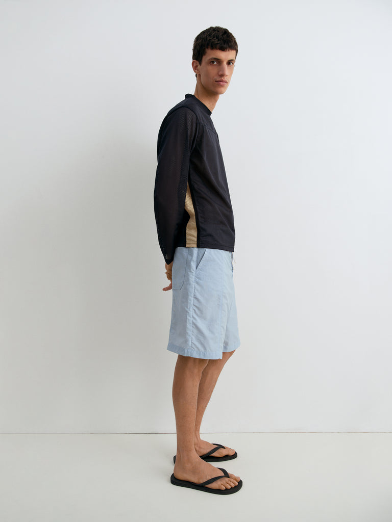 Light blue regular-fit shorts. Designed for women and men in lightweight fine twill with a soft texture. Features side pockets, a zip fly with a front drawstring closure, and tonal stitching details along the seams.