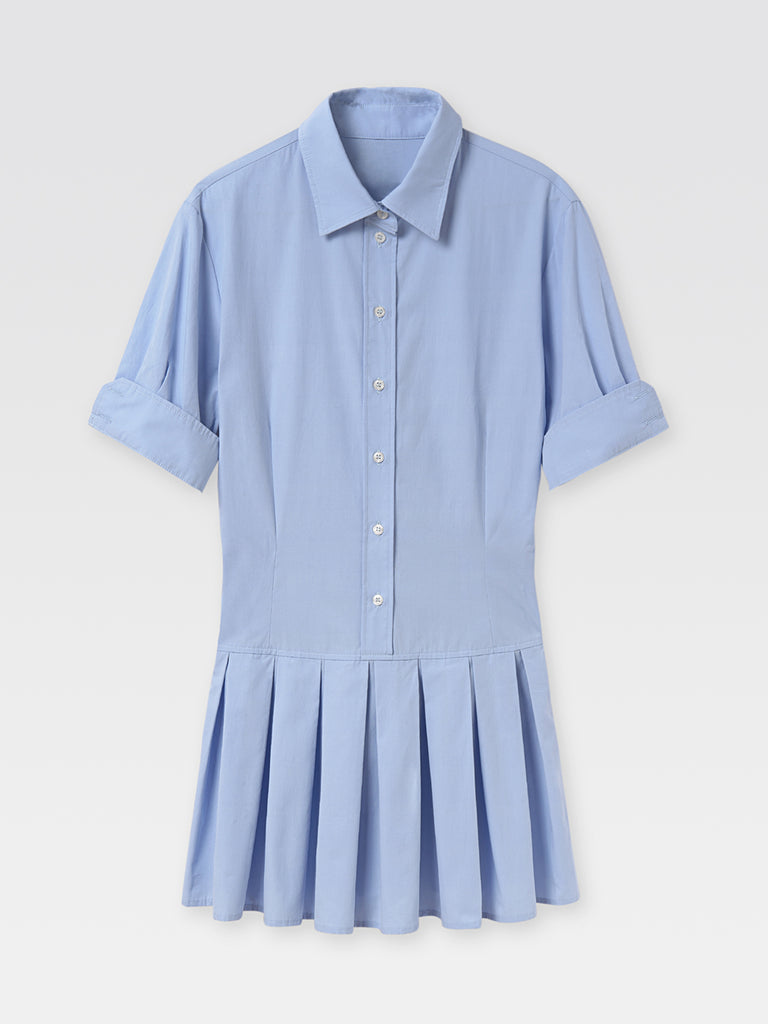 Short shirtdress in blue poplin with a pointed shirt collar and short, cuffed sleeves. Features a tonal button placket at the front and a flared skirt with pleats for added movement. Side zipper closure for a seamless fit. Tailored silhouette.