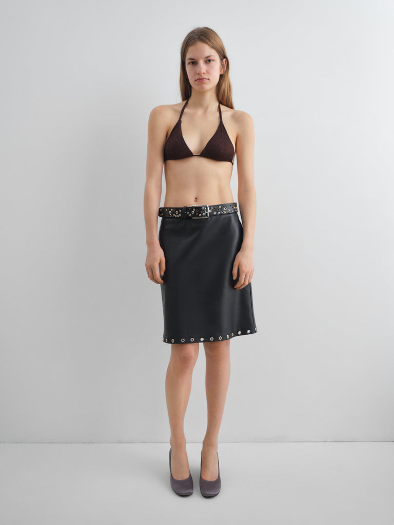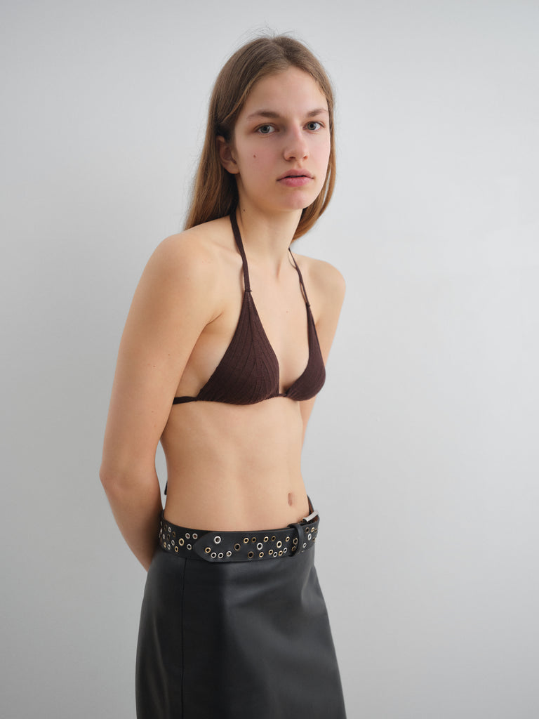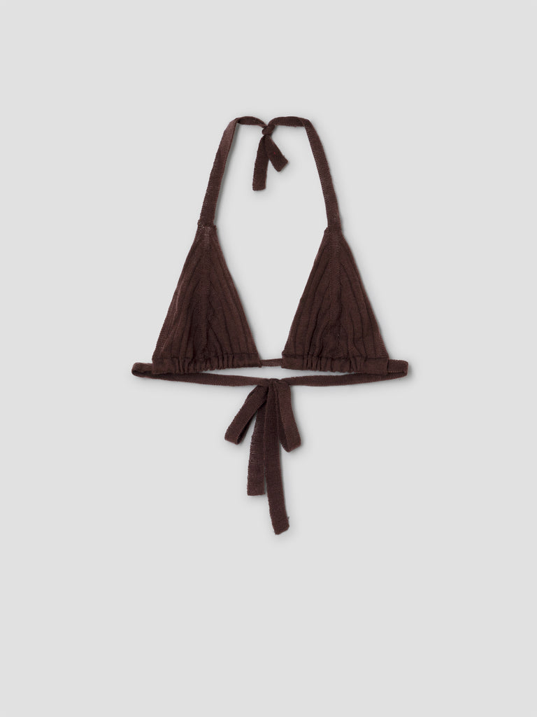 Brown ruched triangle bra with adjustable ties.