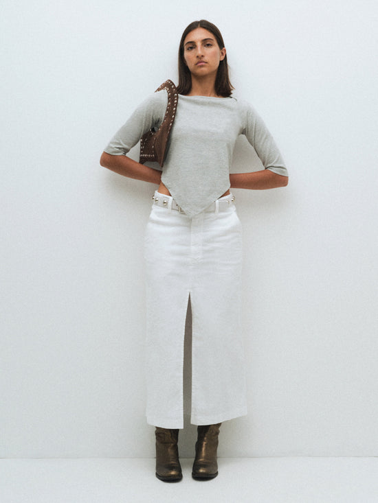 Three quarter length light grey t-shirt with irregular triangle shape hem.