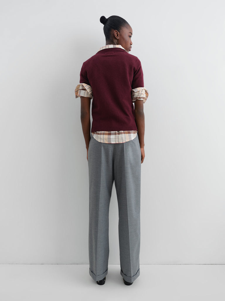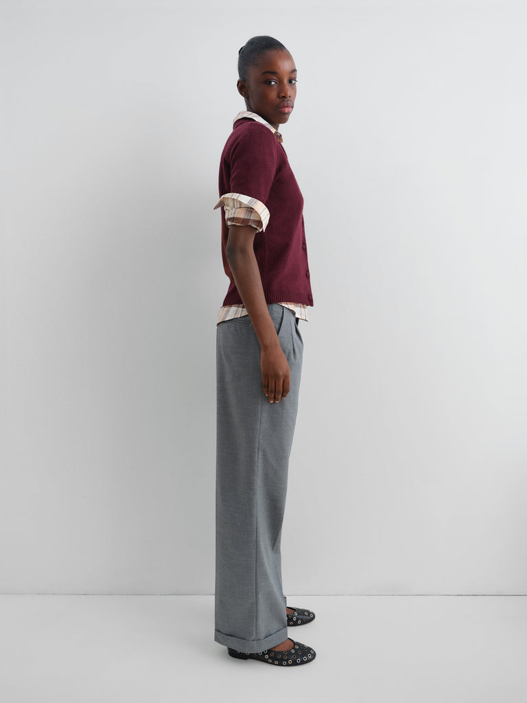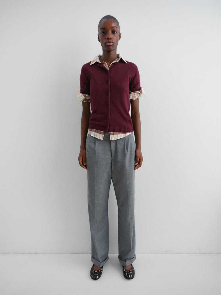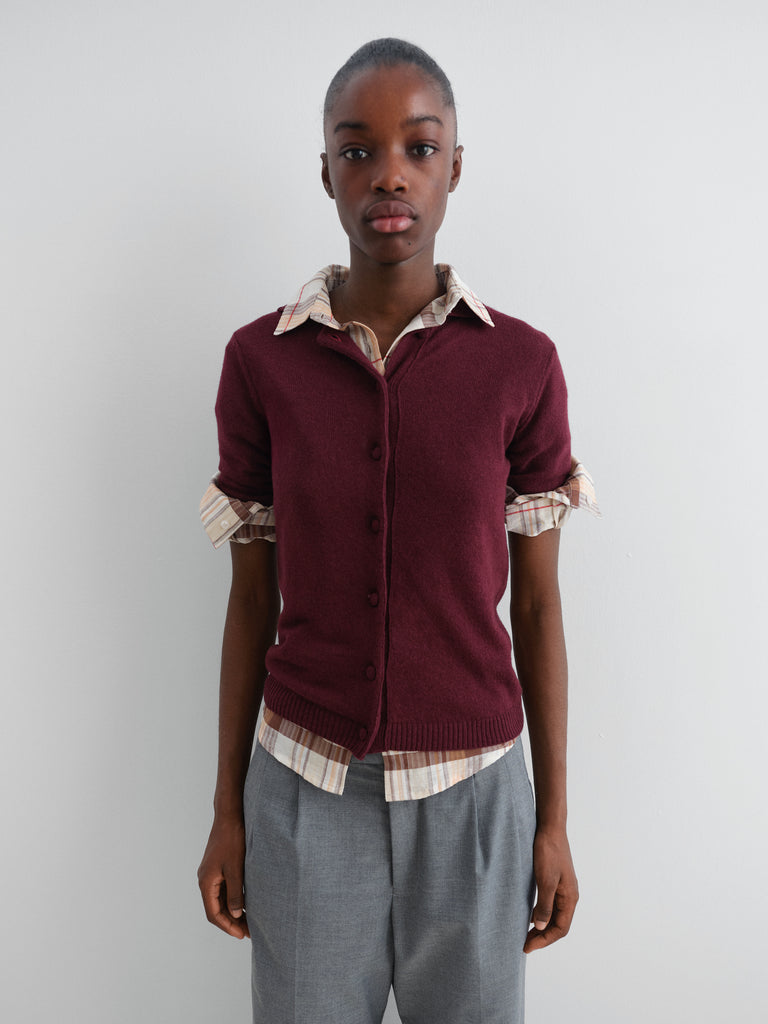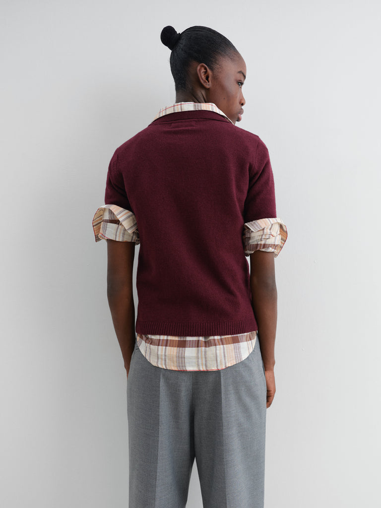 Burgundy short-sleeve knit polo cardigan.