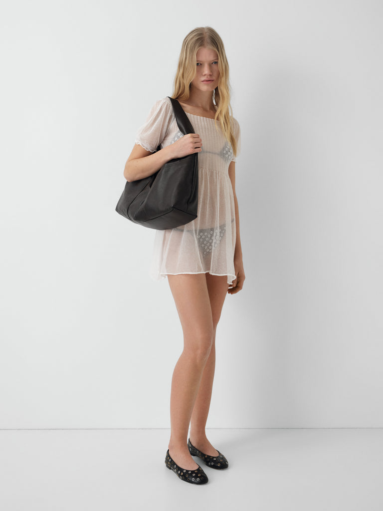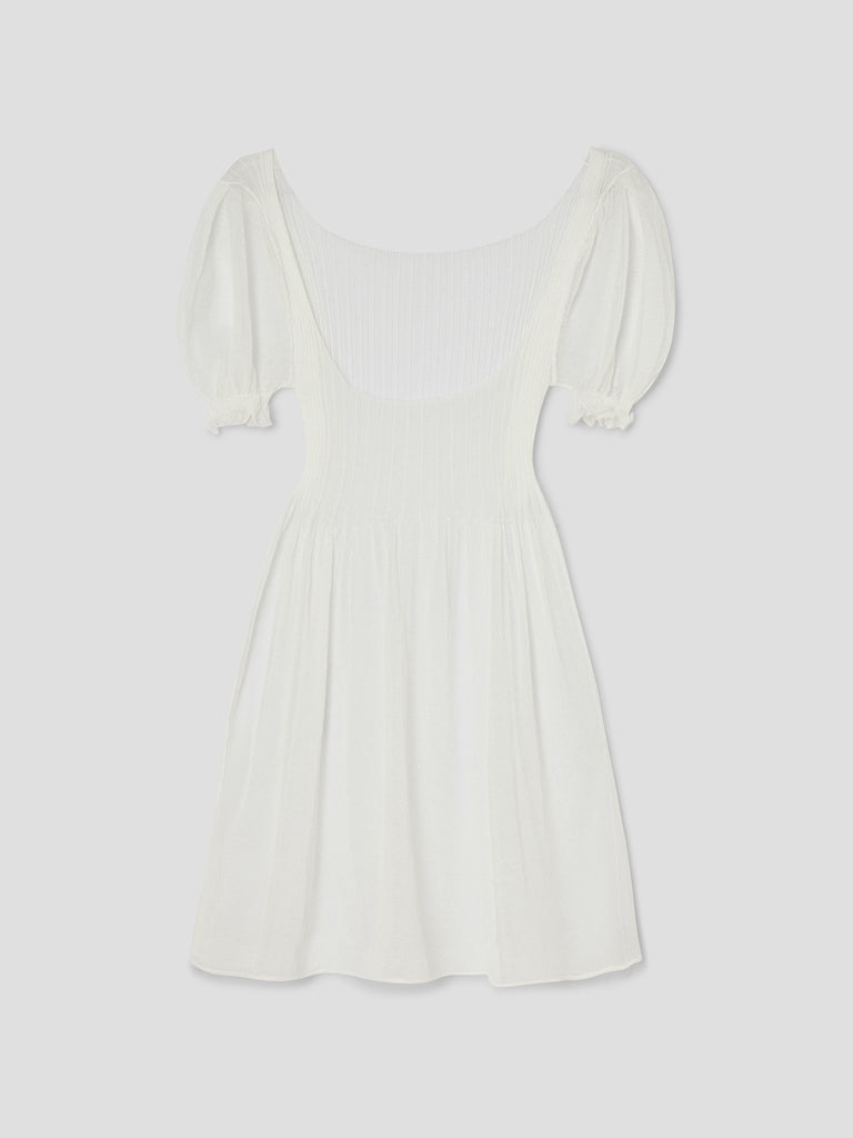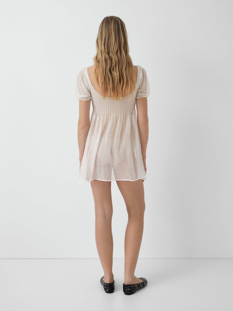 White semi-sheer mini dress with a curved scoop neckline.
