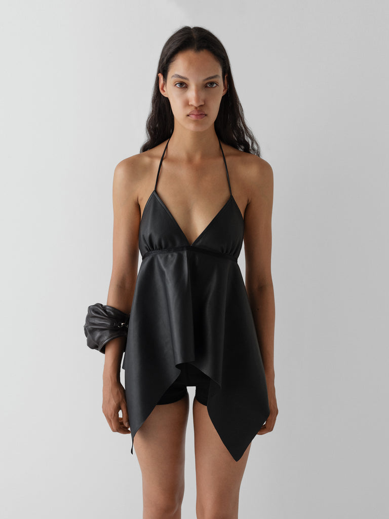 Black leather top with pointed hem.