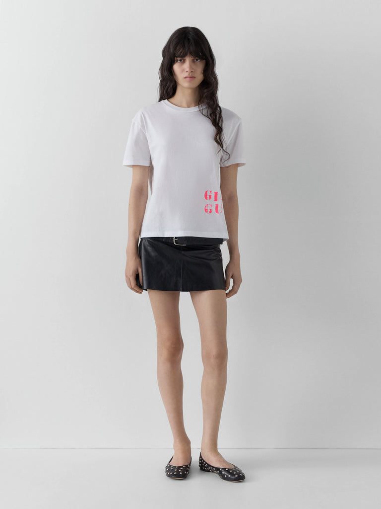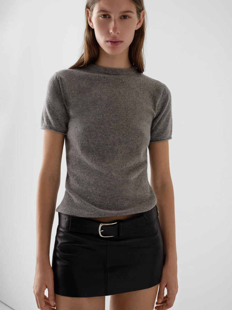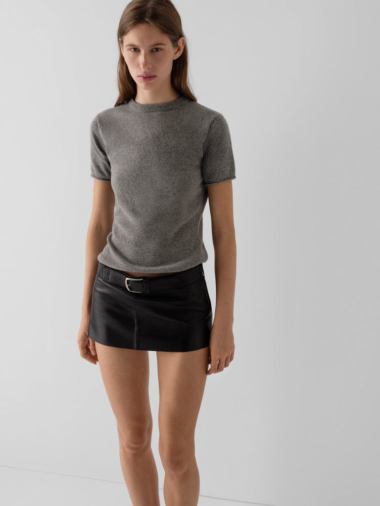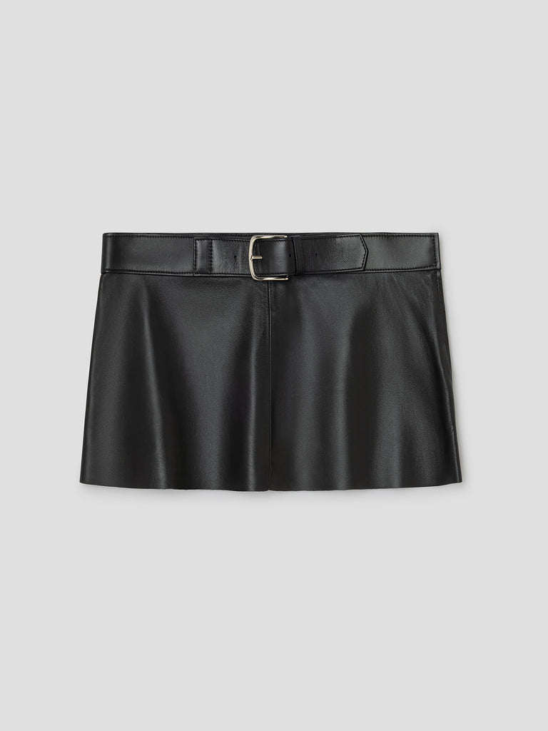 Black leather mini skirt with silver-buckle belt.