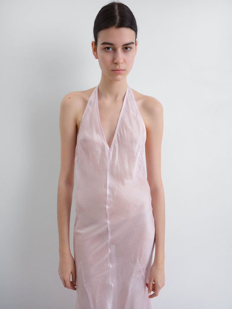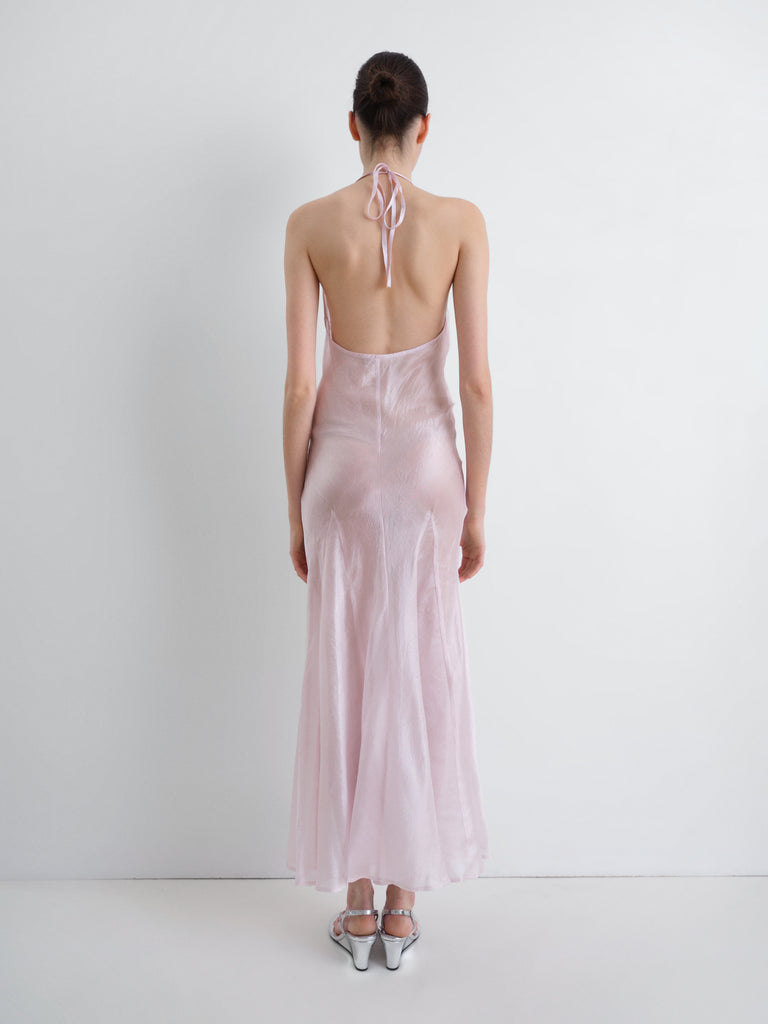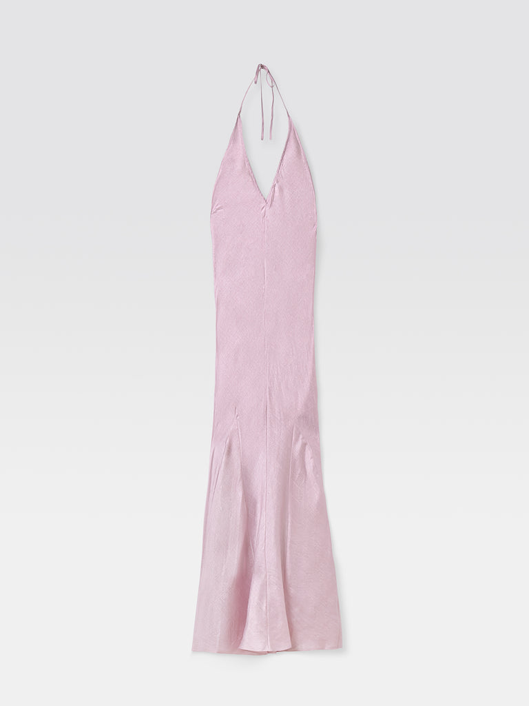 Pink women's dress in wild silk with a halter neckline. Features a V-cut front, godet inserts at the hem and floor-length silhouette. Tied at the back with matching straps.