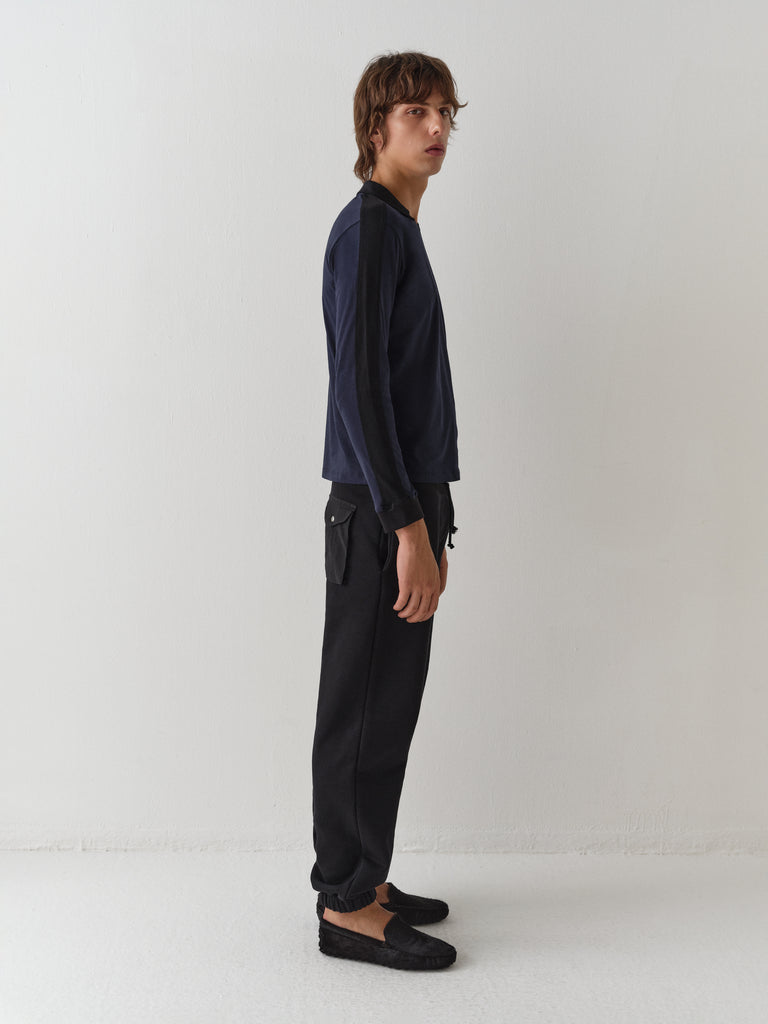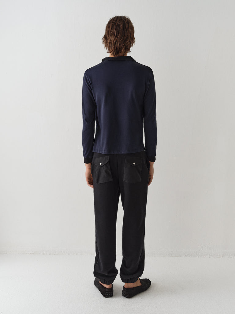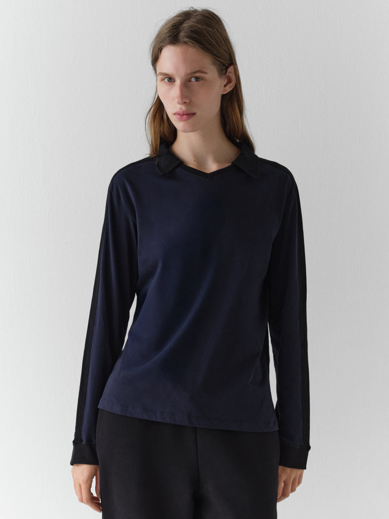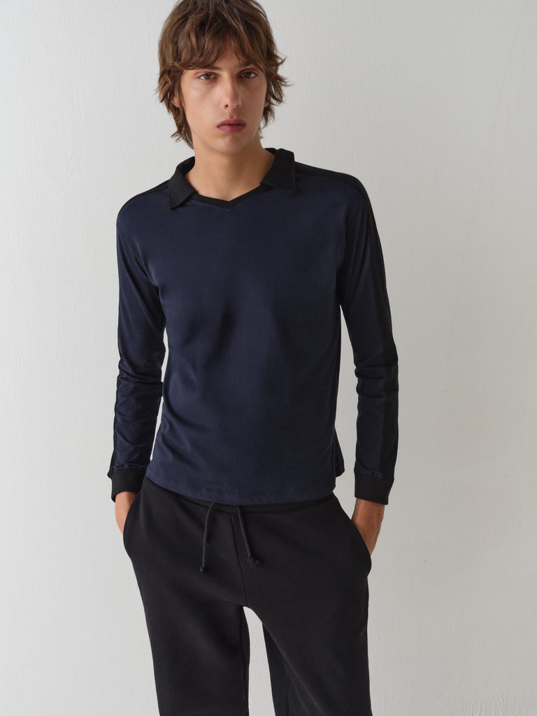 Dark blue polo t-shirt with black stripe detail.