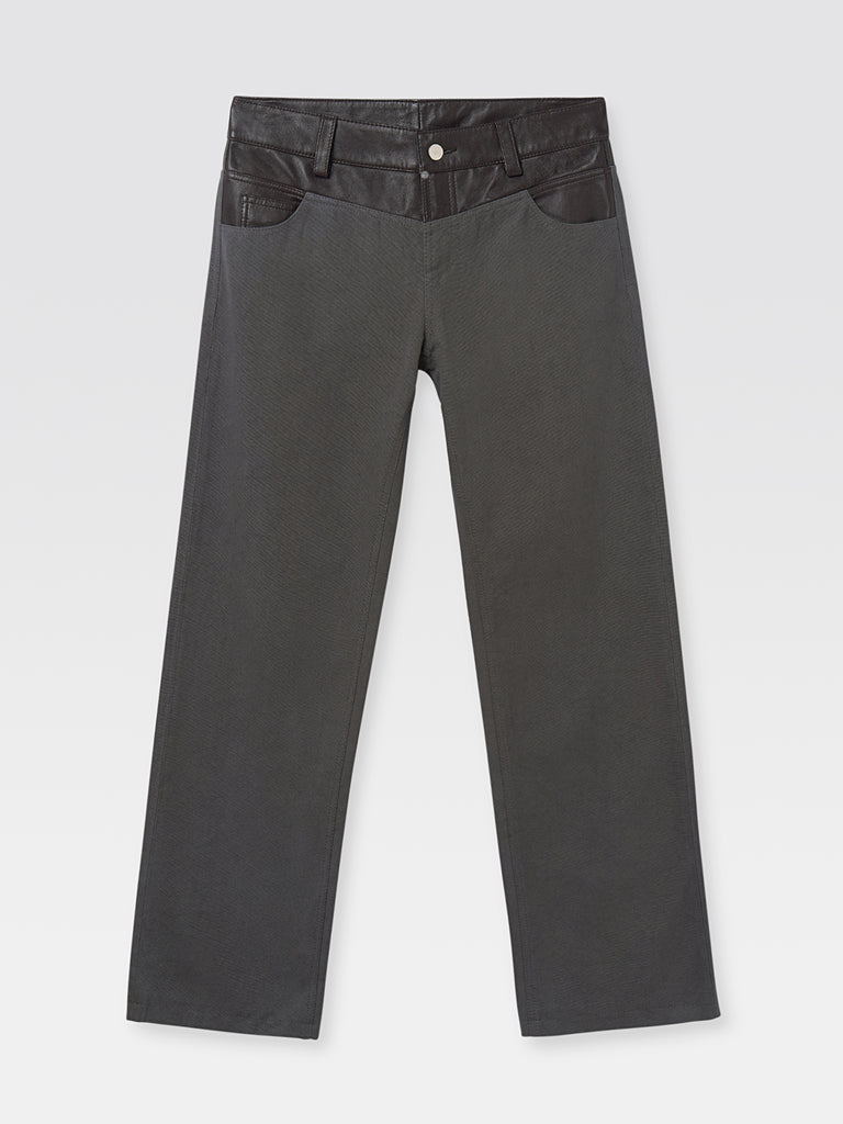 Straight-fit women’s green trousers crafted from canvas with a subtle leather contrast at the waistband and upper panel. Designed with crescent front pockets and back patch pockets. Finished with a sleek metallic button and zip closure.