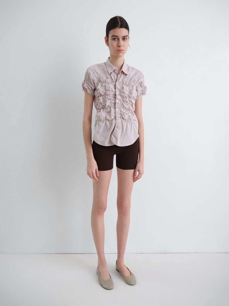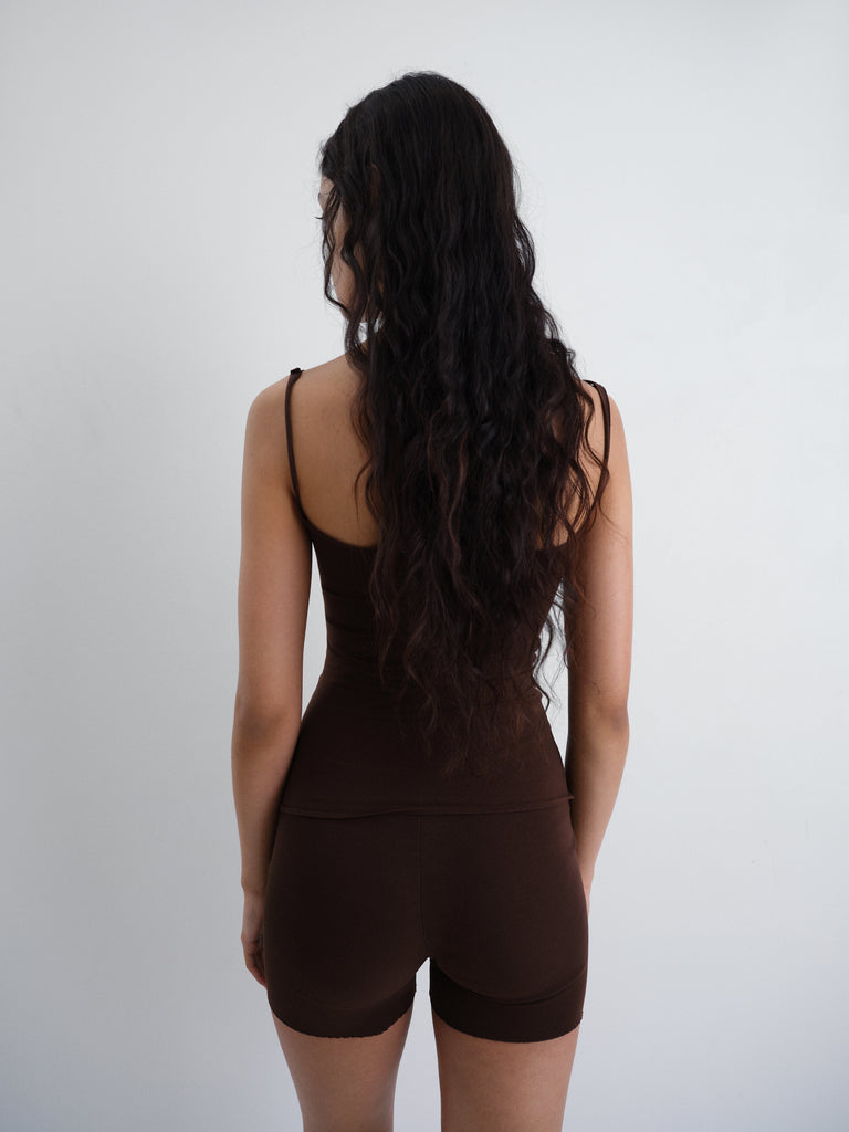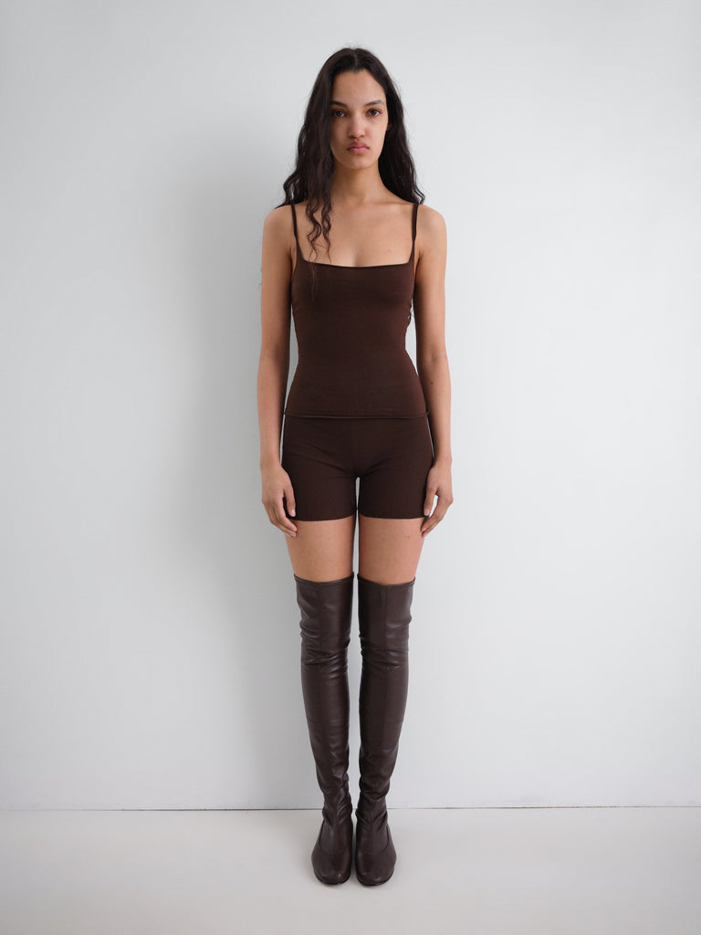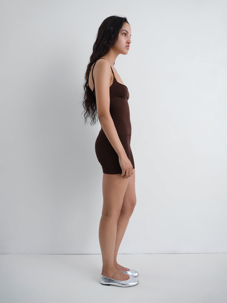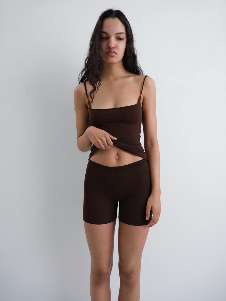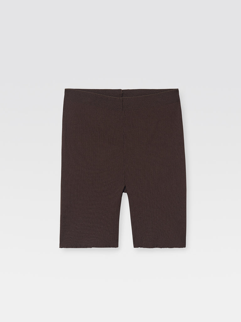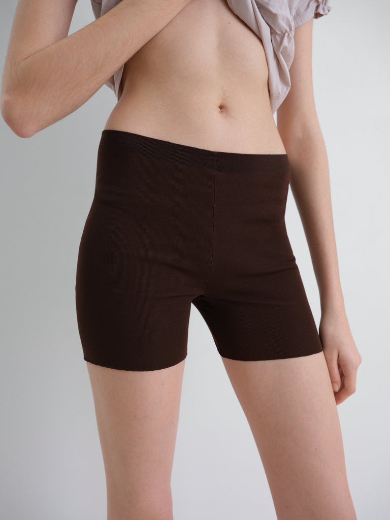 Slim-fit mini women's shorts crafted in fine-knit fabric. Featuring a plain brown tone and elastic texture for a comfortable silhouette.
