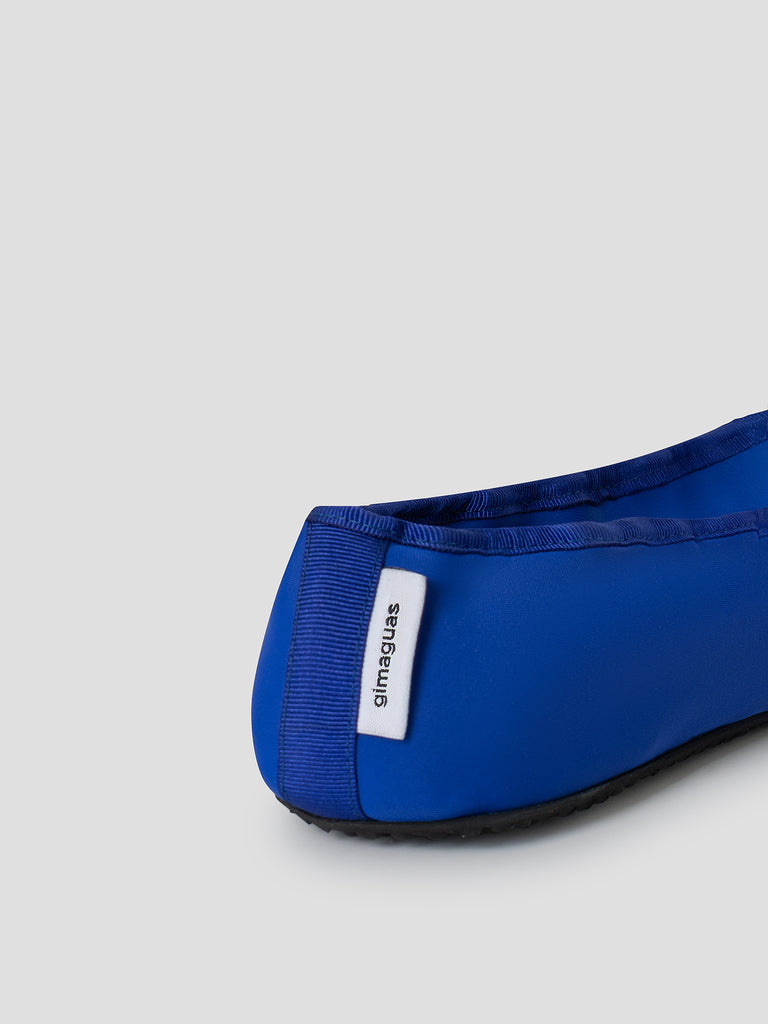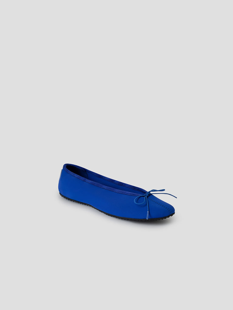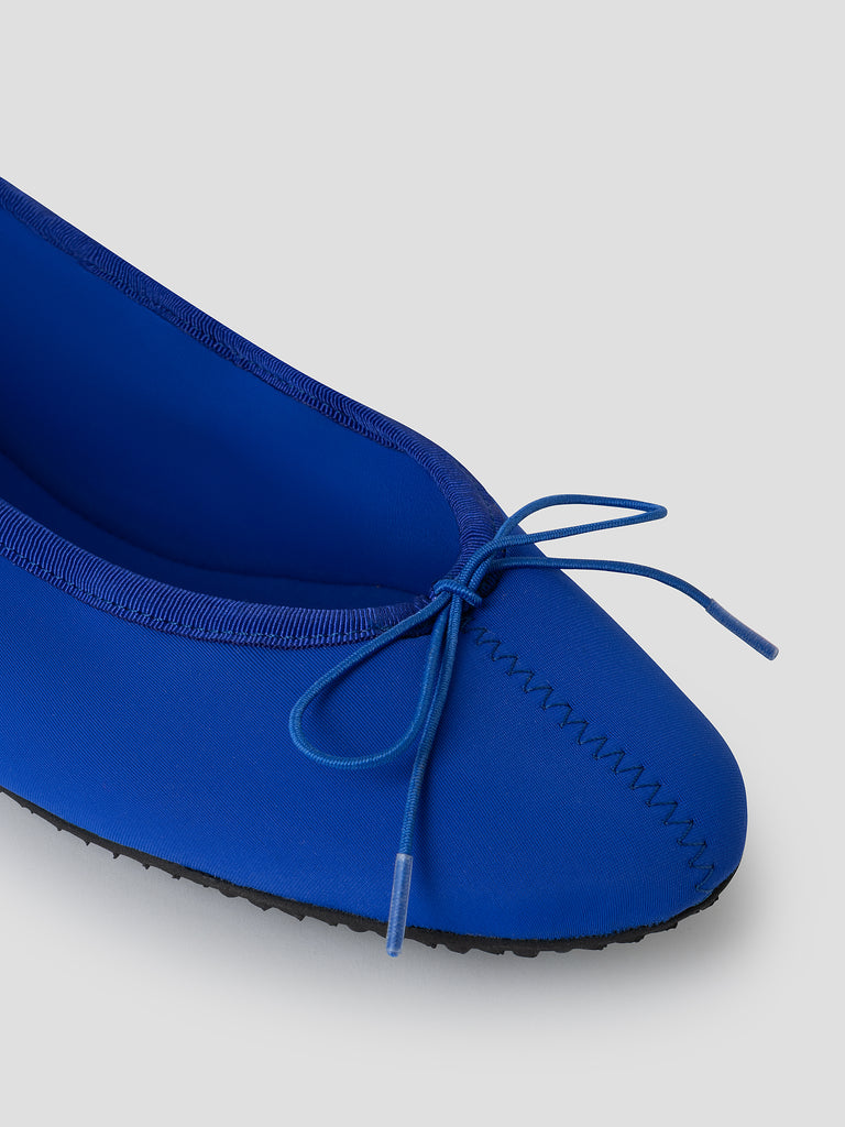 Cobalt blue neoprene ballet flats with grosgrain trim and tonal zigzag stitching.