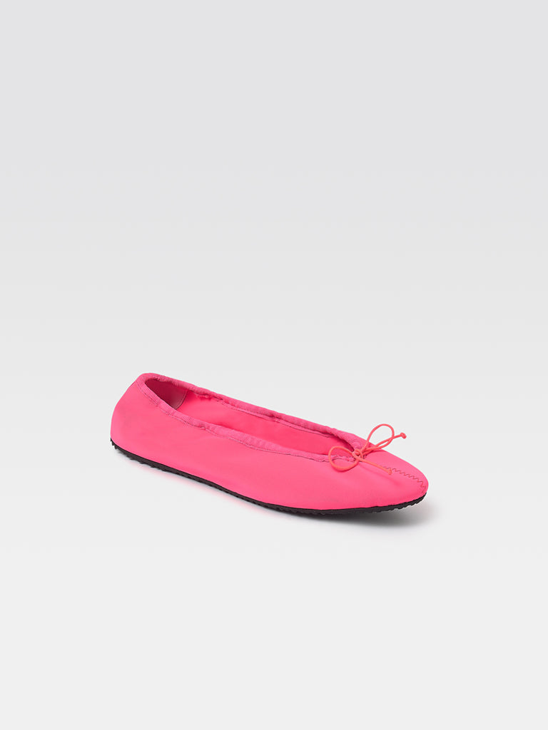 Neon pink neoprene ballet flats with grosgrain trim and tonal zigzag stitching.