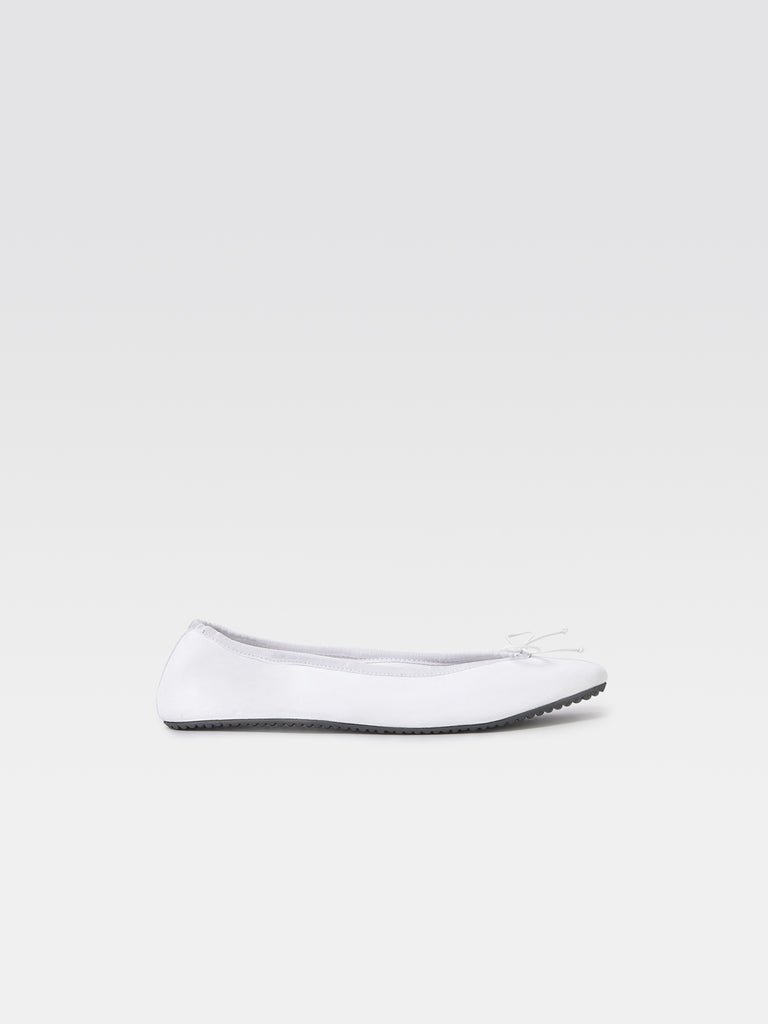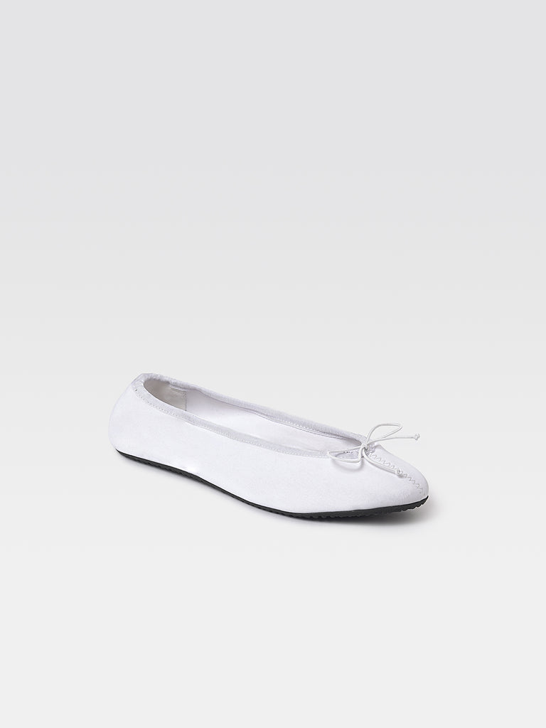 White neoprene ballet flats with grosgrain trim and tonal zigzag stitching.