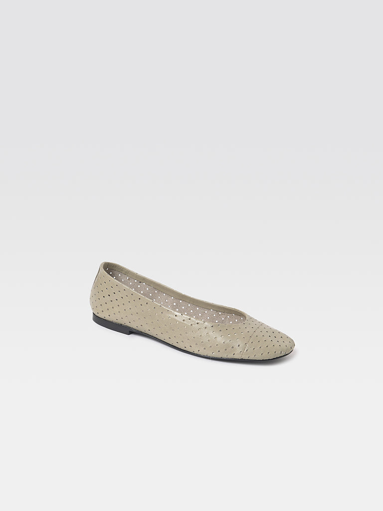 Perforated taupe leather women's ballerinas, designed with a soft leather lining and sole. Crafted from leather with a naturally worn finish.