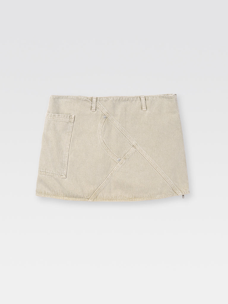 Low rise mini jean-collage skirt in beige with zip closure and belt loops and a single patch pocket.