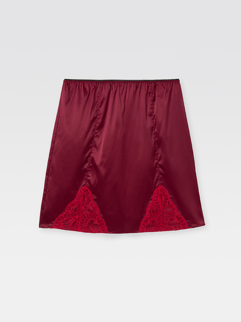 Midi skirt made from satin fabric in burgundy, featuring lace patches on the bottom.