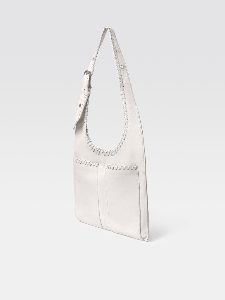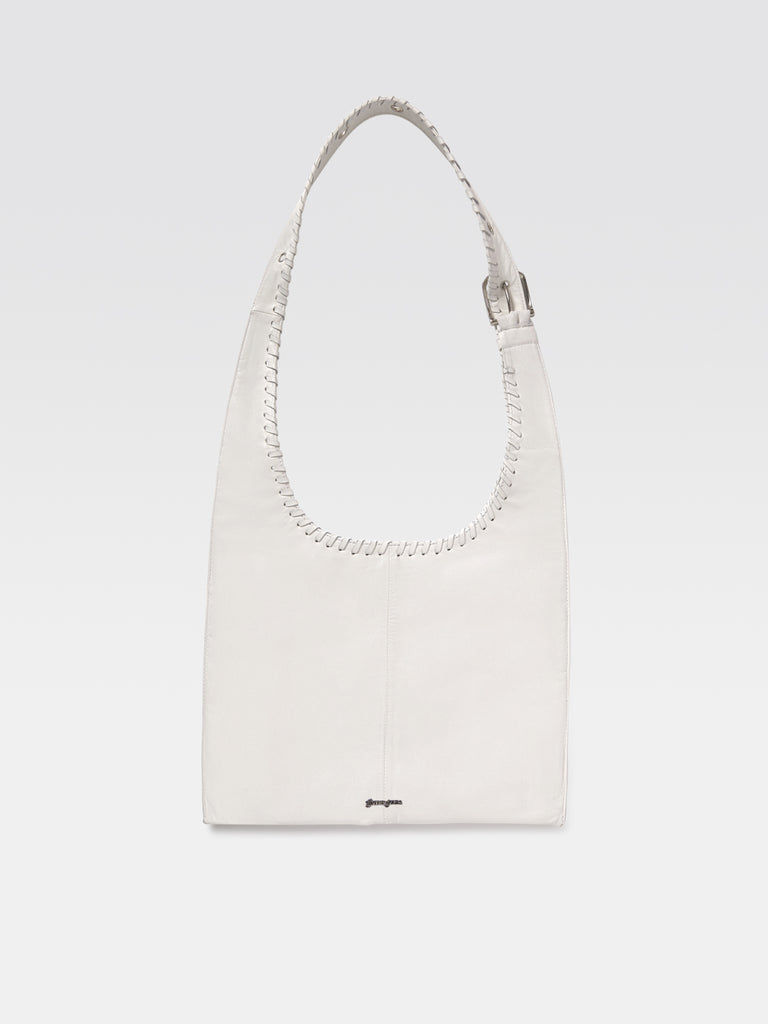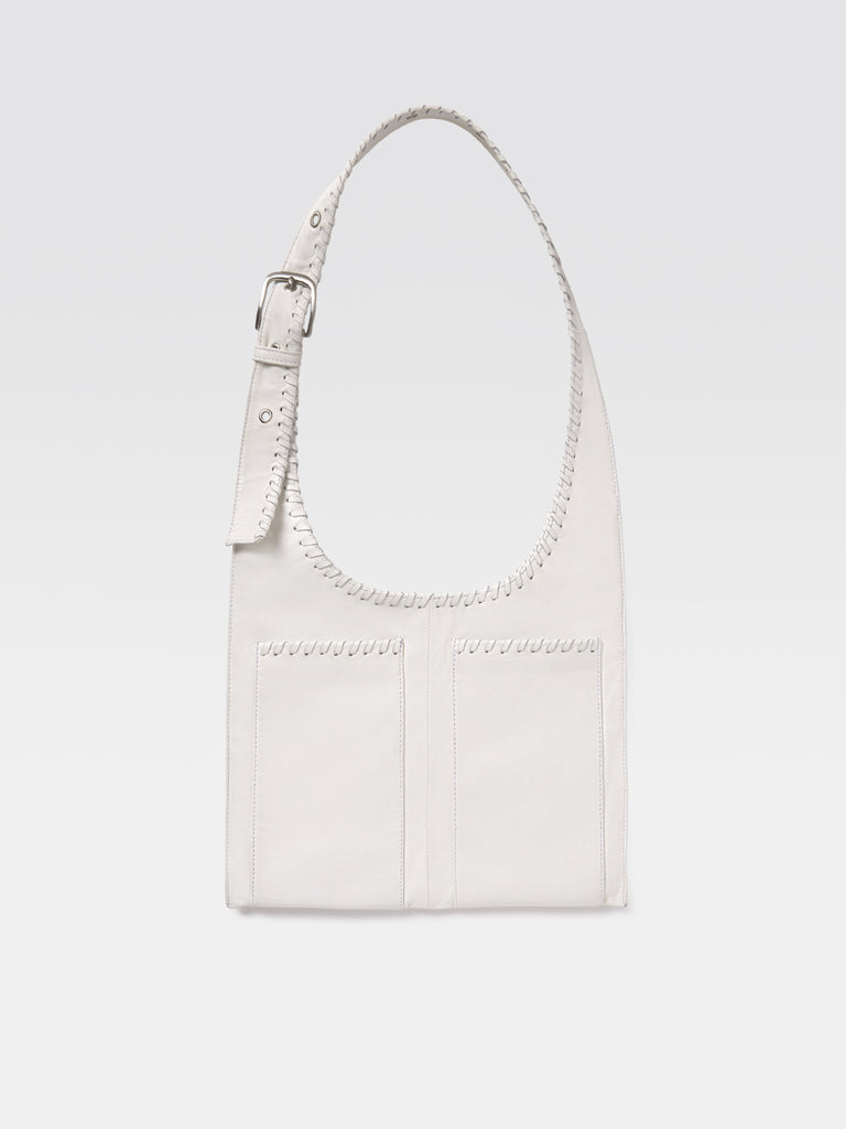 White lamb leather women's crossbody bag with a long flat adjustable handle. Adorned with braids along the long flat handle and the pockets, complementing its structured silhouette. Designed with one spacious interior pocket and two sleek exterior pockets, cotton lining, and a discreet magnetic closure. Finished with a metallic Gimaguas logo on the back.