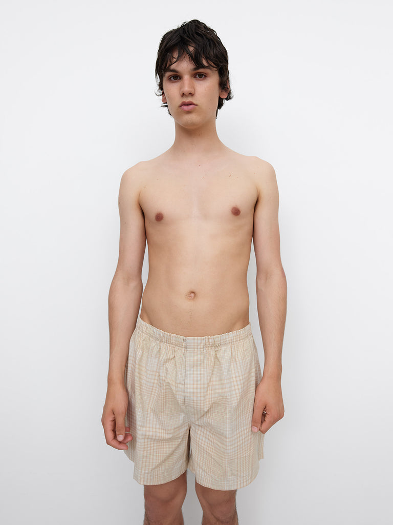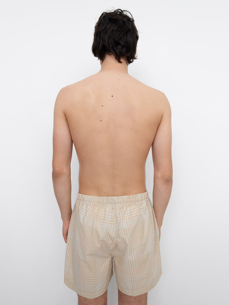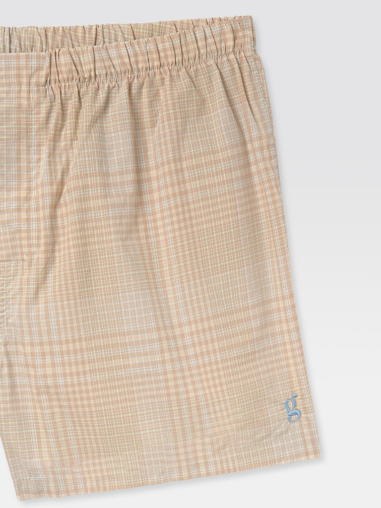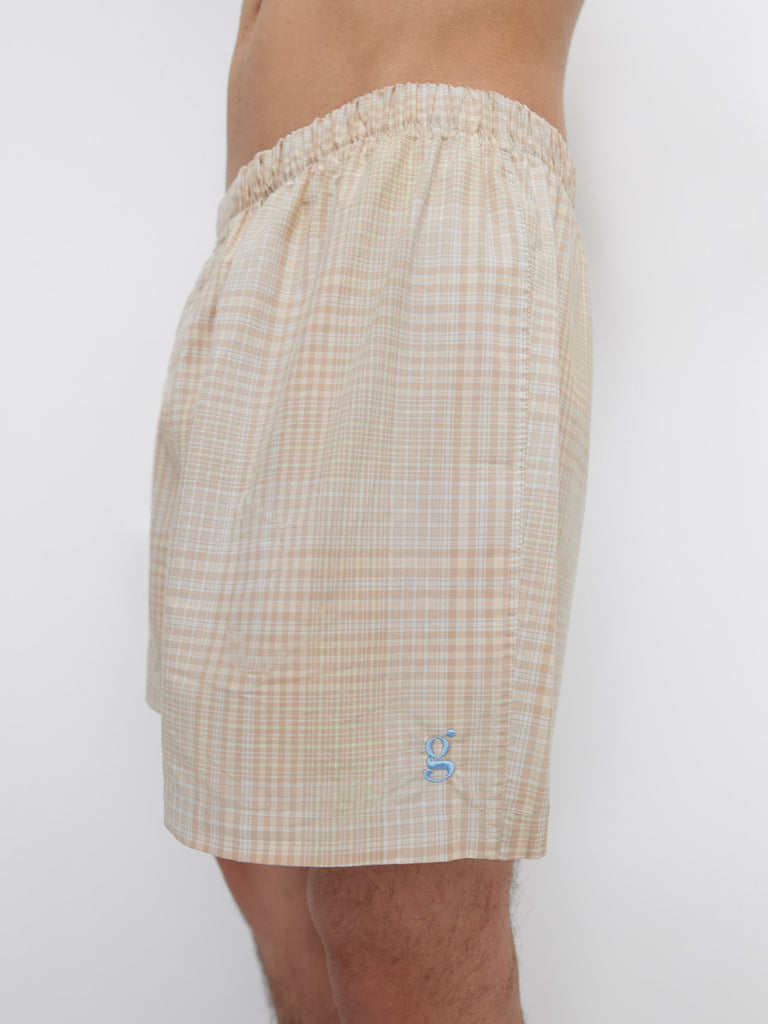 Brown checks boxer shorts in lightweight cotton poplin. Designed for women and men fit with an elastic waistband and relaxed silhouette. Featuring an embroidered "G" detail on the leg and a matching fabric pouch for storage.