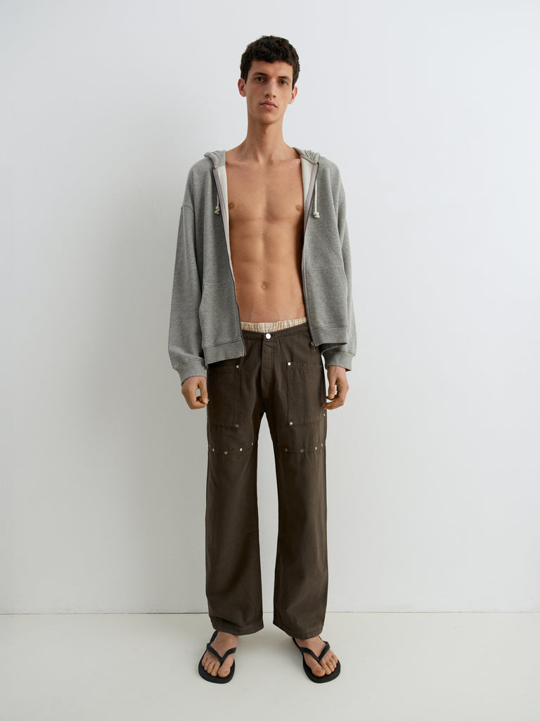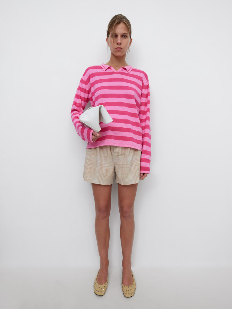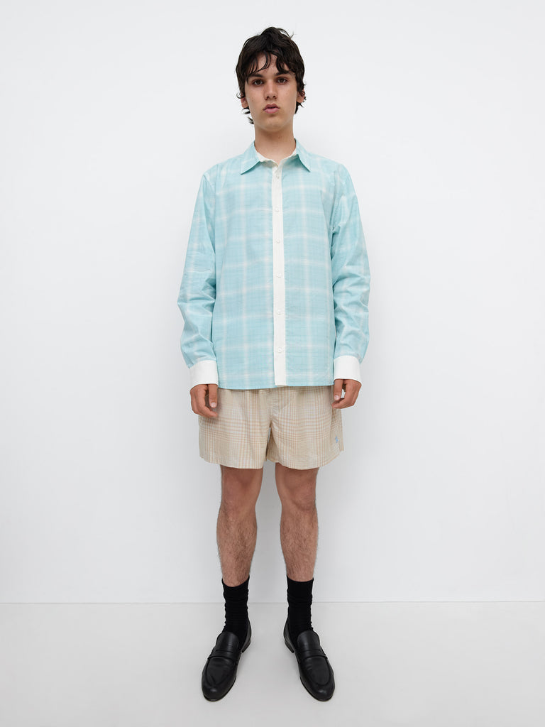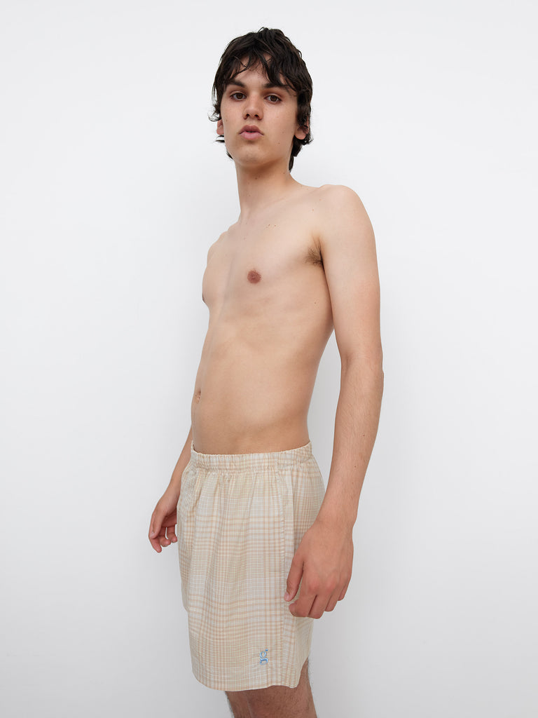 Brown checks boxer shorts in lightweight cotton poplin. Designed for women and men fit with an elastic waistband and relaxed silhouette. Featuring an embroidered "G" detail on the leg and a matching fabric pouch for storage.