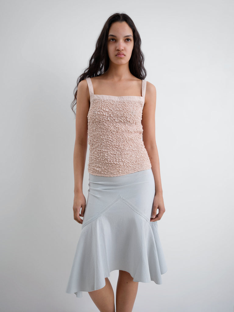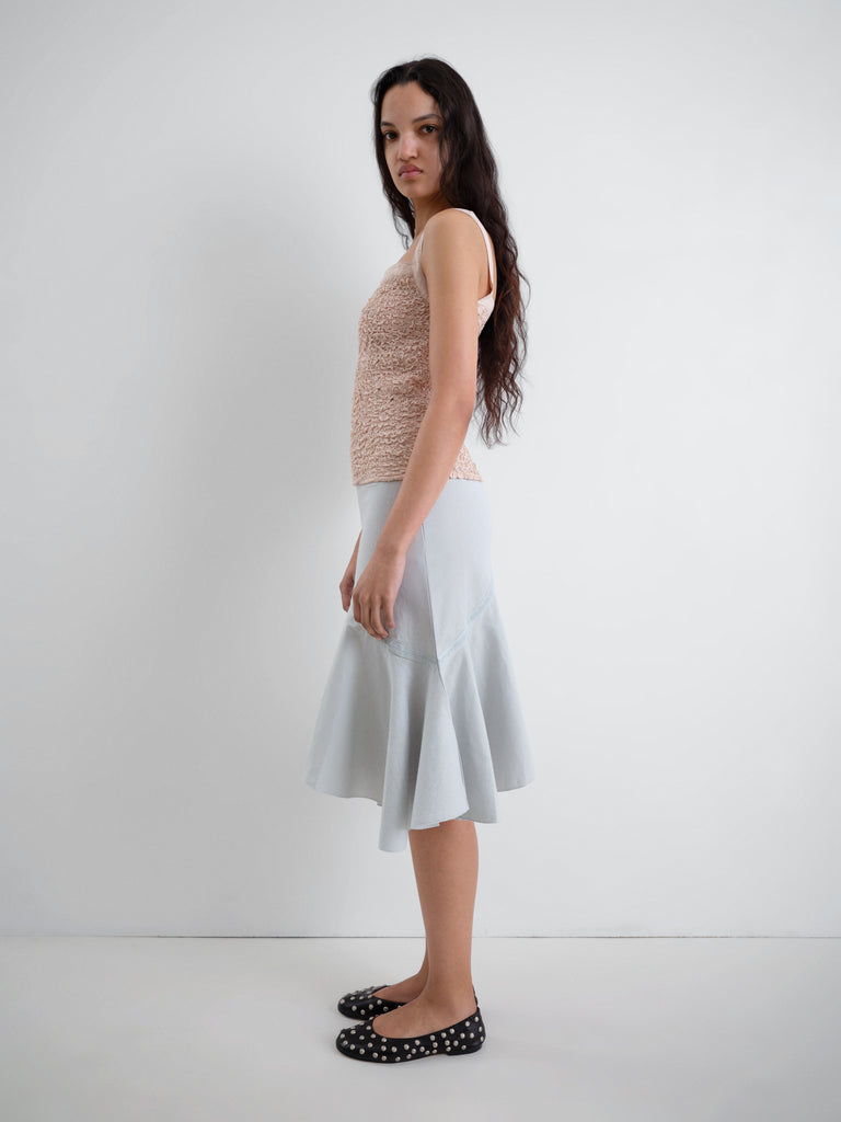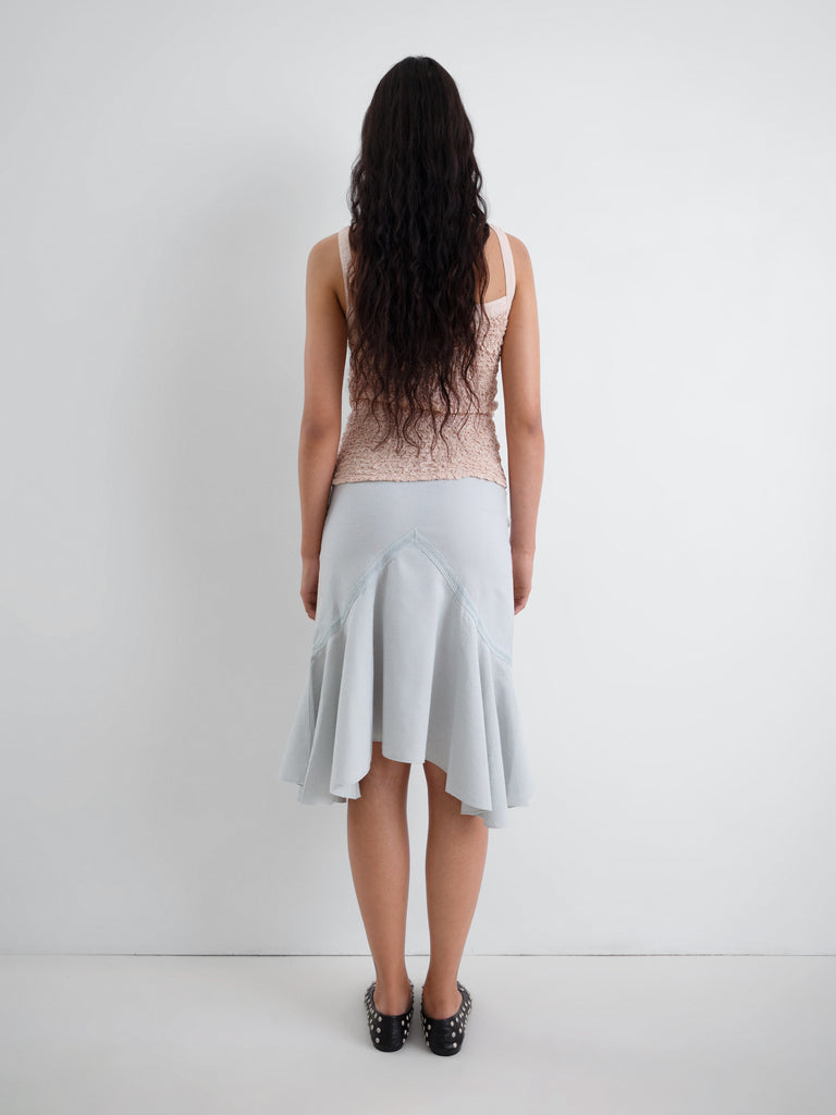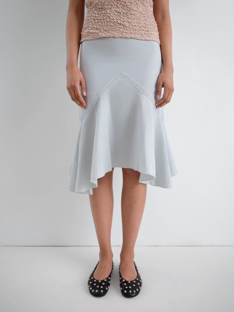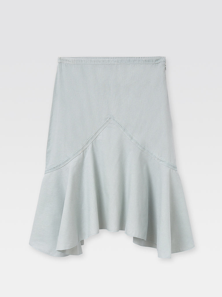 Grey midi women's skirt in textured cotton. Fitted at the waist with a flared hem. Features a triangle-cut panel with scalloped seams and fluid movement.