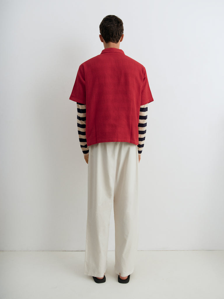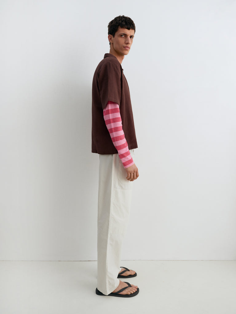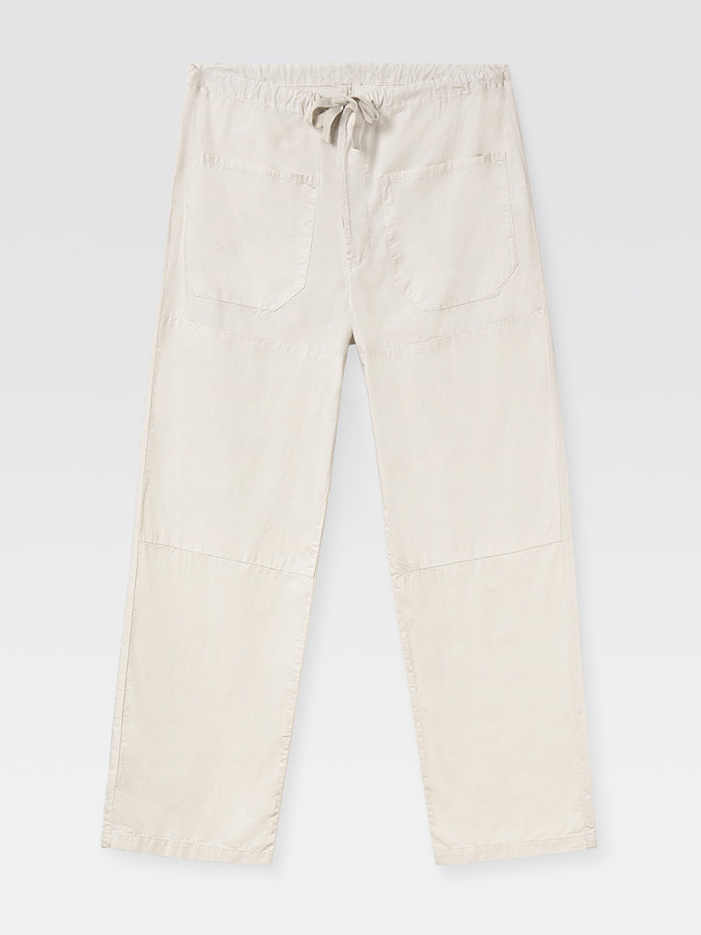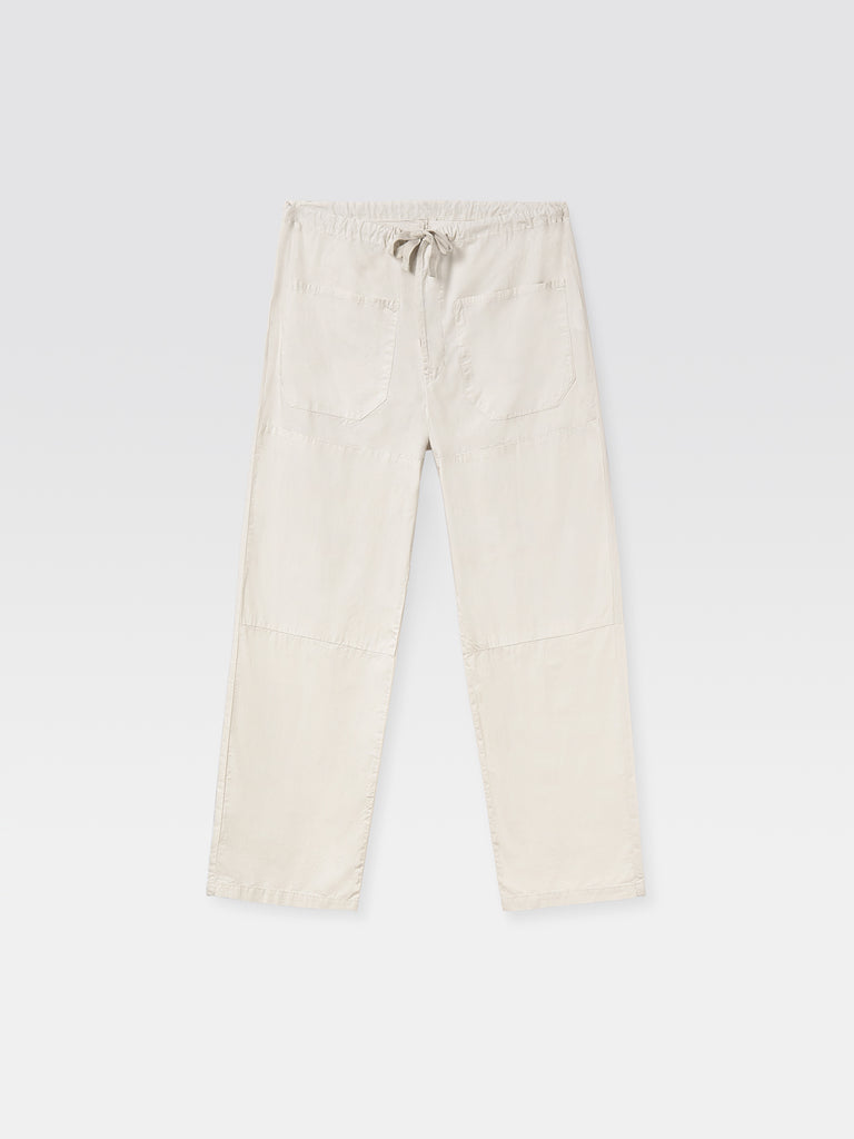 Off-white long trousers in lightweight twill. Perfect for women and men, designed with a loose fit and a relaxed silhouette. Features an adjustable drawstring waistband, large front patch pockets and horizontal seam details along the legs.