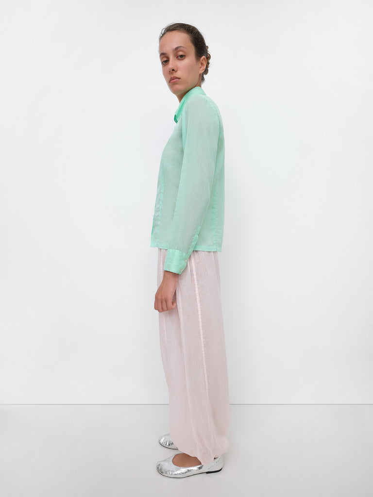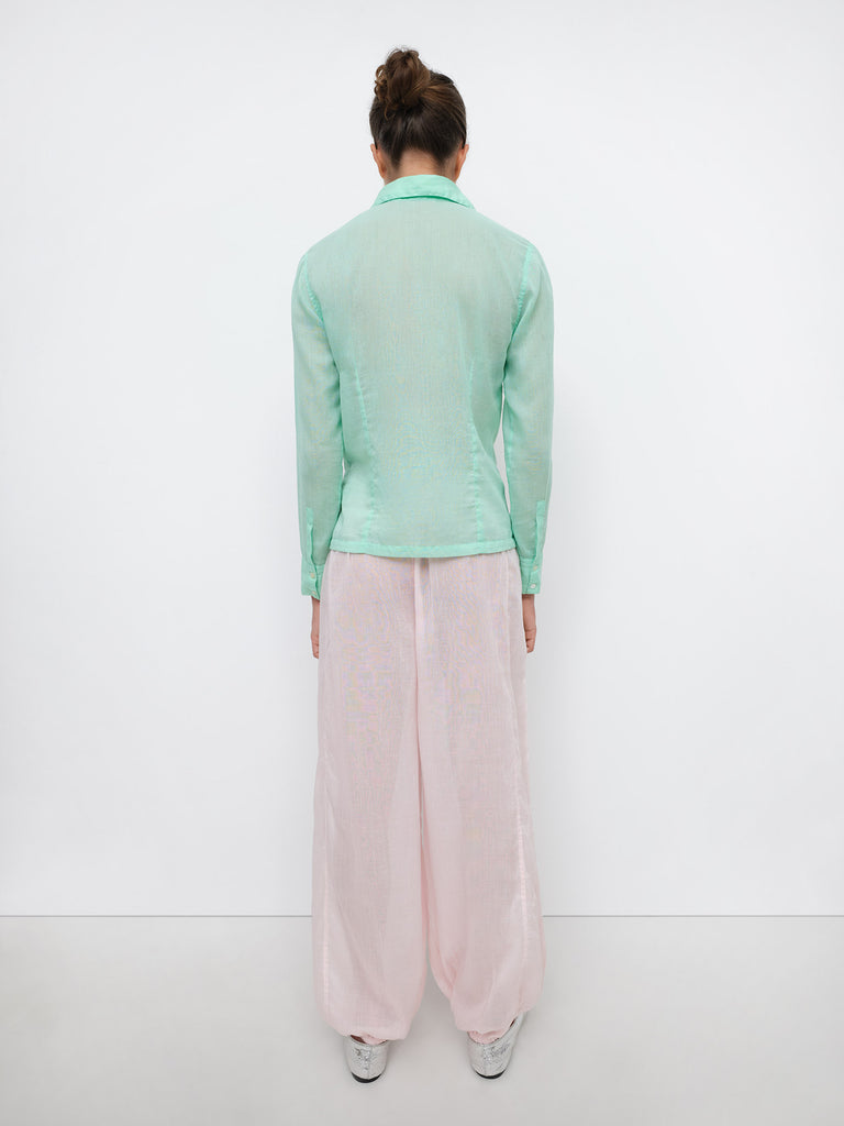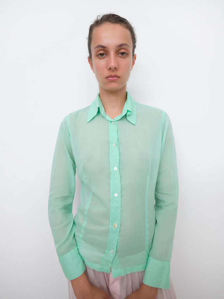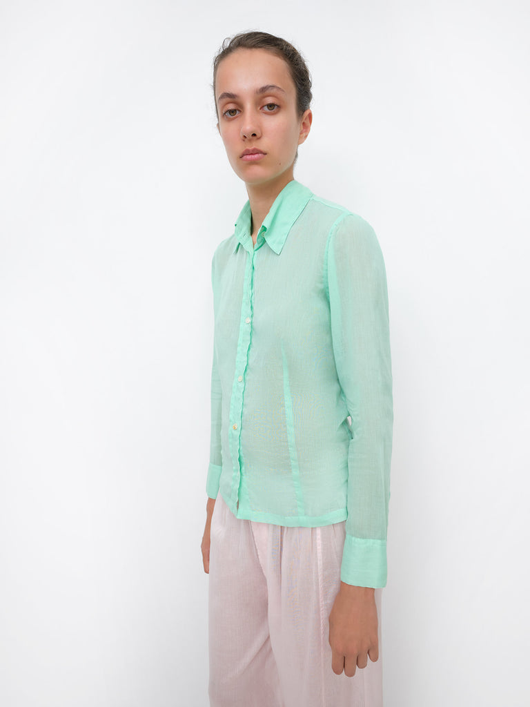 Green women's long-sleeve cotton shirt with a tailored fit. Features a classic collar, tonal buttons, and cuffed sleeves. Lightweight, fresh, and ideal for warm-weather.