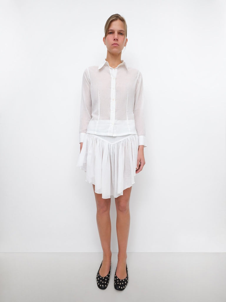 White women's long-sleeve cotton shirt with a tailored fit. Features a classic collar, tonal buttons, and cuffed sleeves. Lightweight, fresh, and ideal for warm-weather.