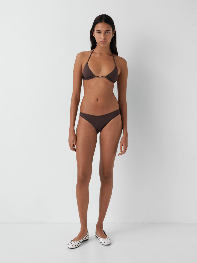 Women's brown bikini bottom with a minimal silhouette.