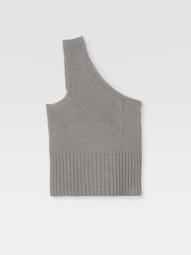 One shoulder knitted top, fitted fit, featuring same fabric rib waist in grey.