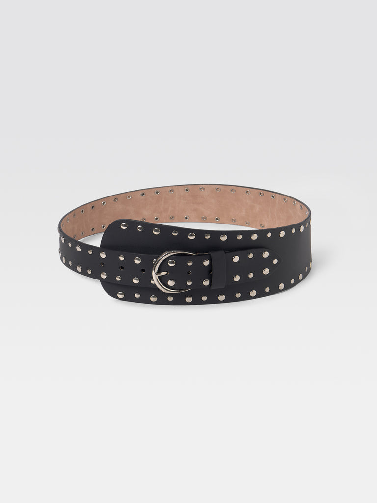 Black asymmetrical leather women's belt adorned with polished metallic studs.