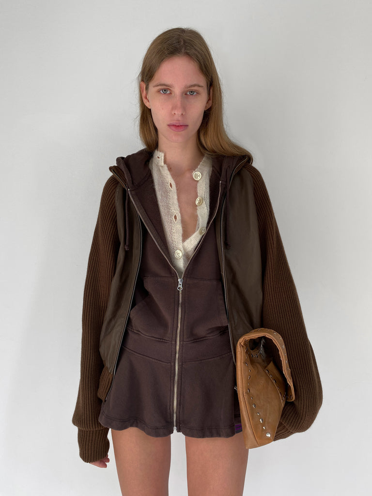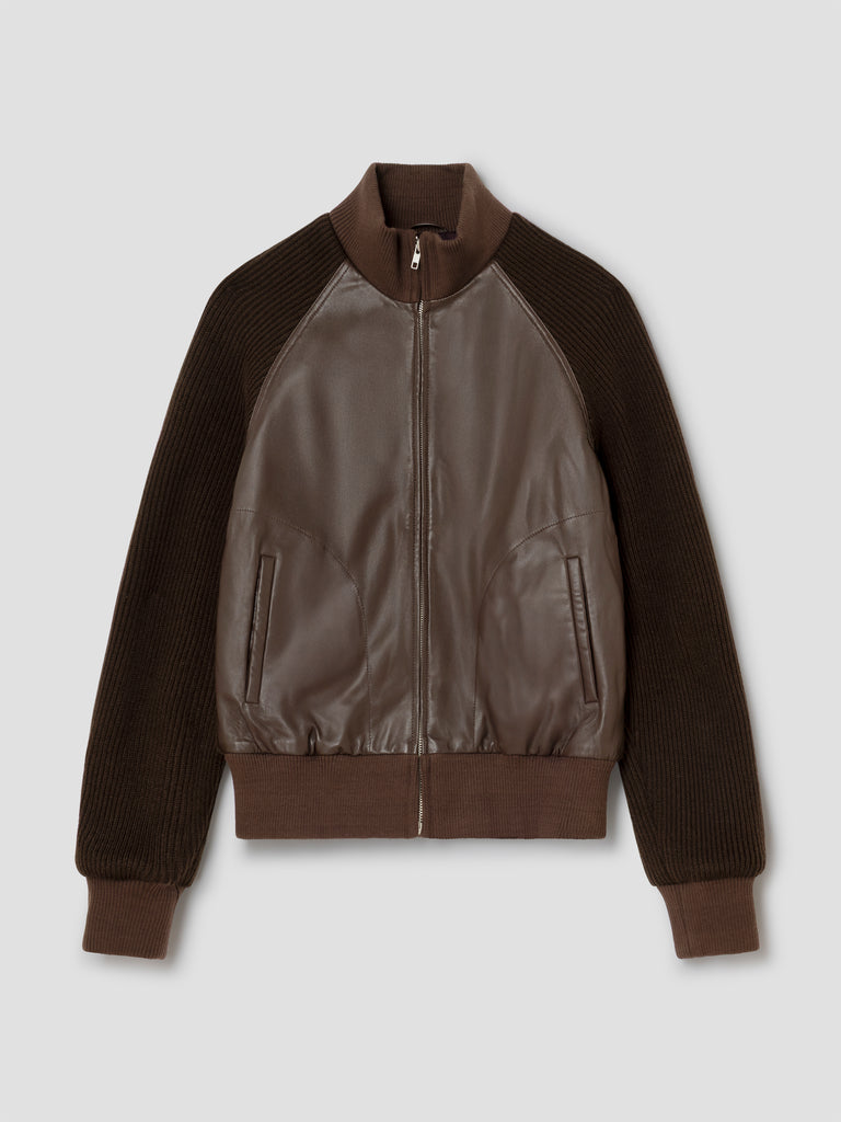 Women’s jacket in chocolate brown, combining a leather body with tonal ribbed knit sleeves, collar, and hem. Designed with raglan sleeves, side welt pockets, and a central zipper closure.