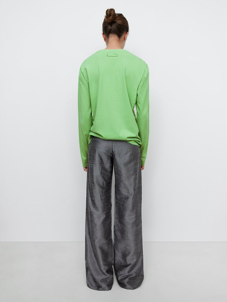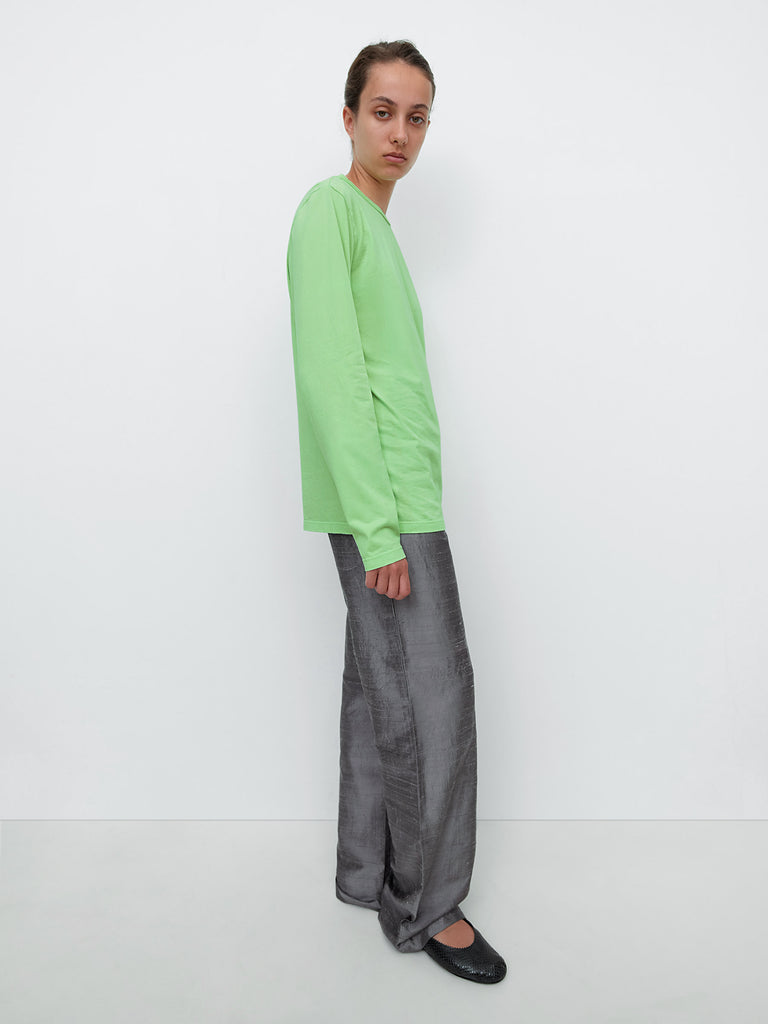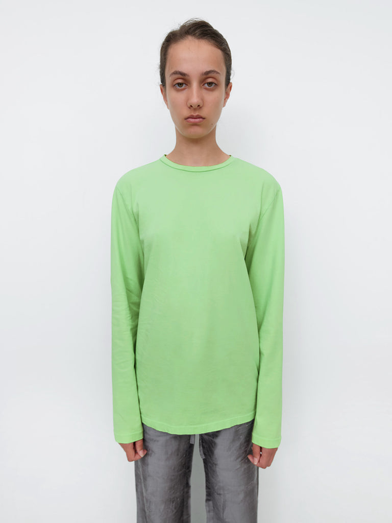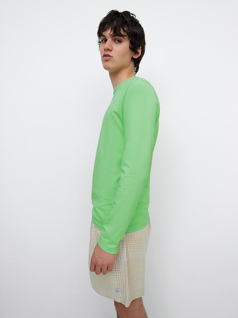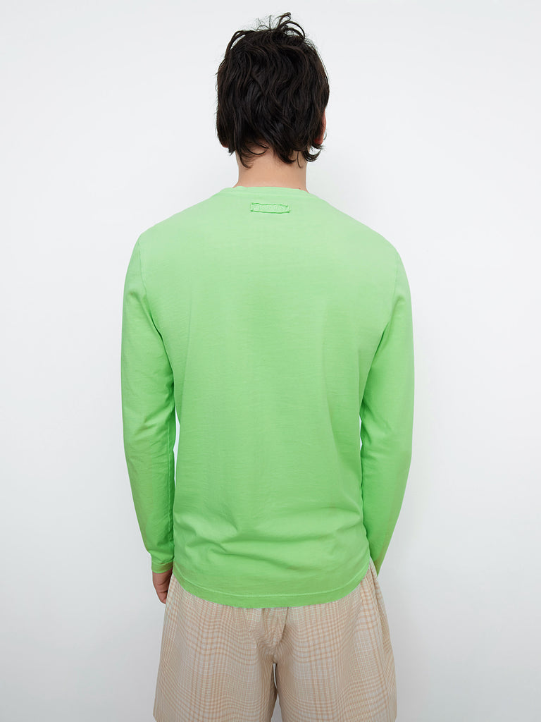 Green long-sleeve t-shirt in a faded wash finish, perfect for women and men. Designed with a round neckline and slightly dropped shoulders, it features a straight fit and relaxed silhouette. Finished with a tonal embroidered logo on the back for subtle detailing.