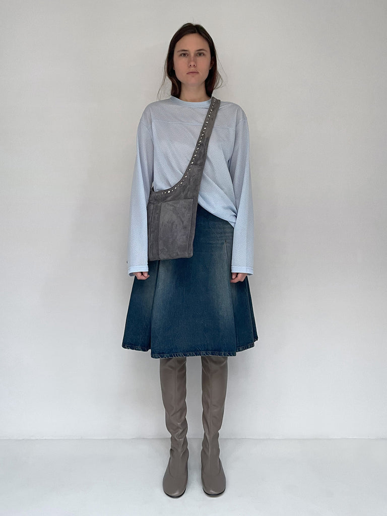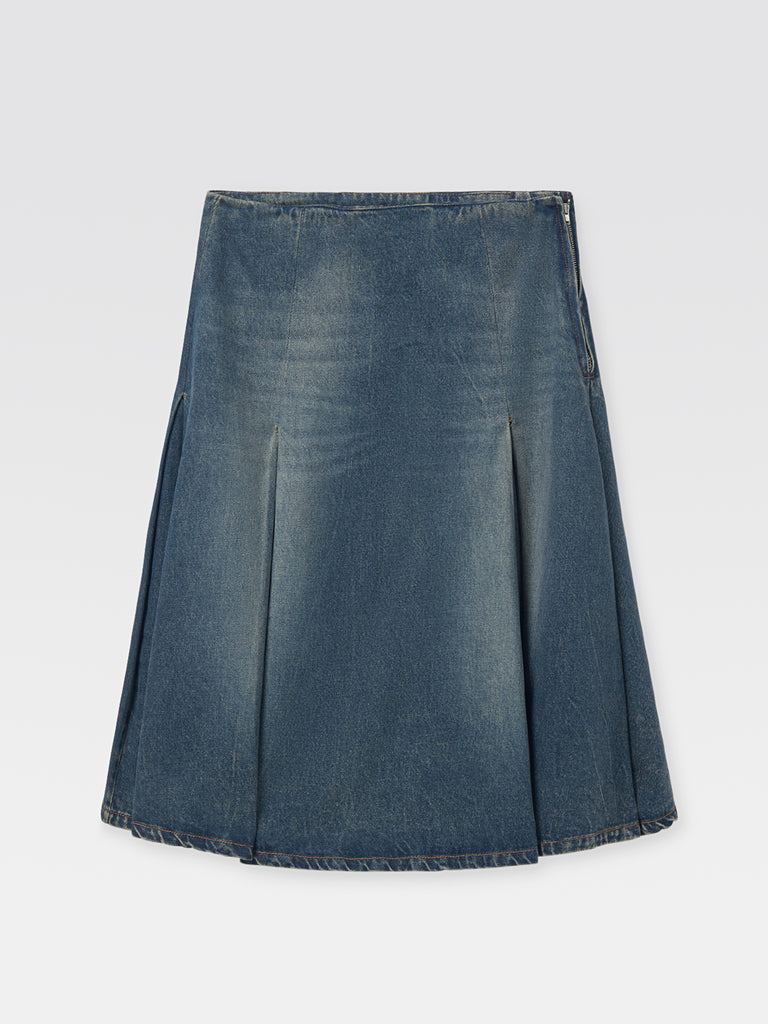 Denim women's skirt featuring a flared hemline and pleats with godets sewn up to the mid-length. Midi length with a side metallic zipper closure.