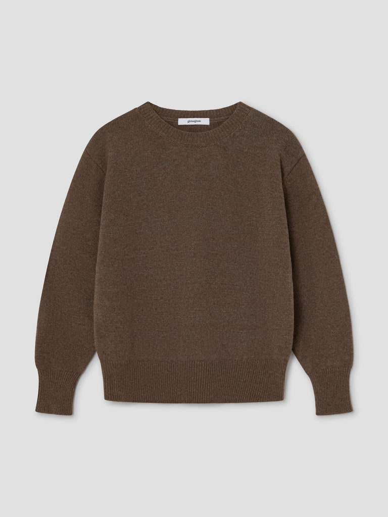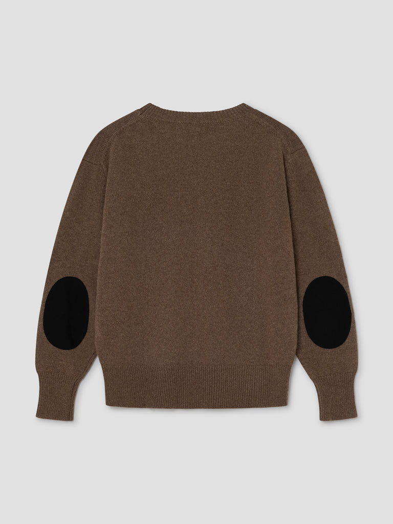 Brown knit women’s sweater in a cashmere-wool blend with a classic crewneck and ribbed collar, cuffs, and hem. This jumper features long sleeves with black contrast elbow patches, adding a subtle contrast.