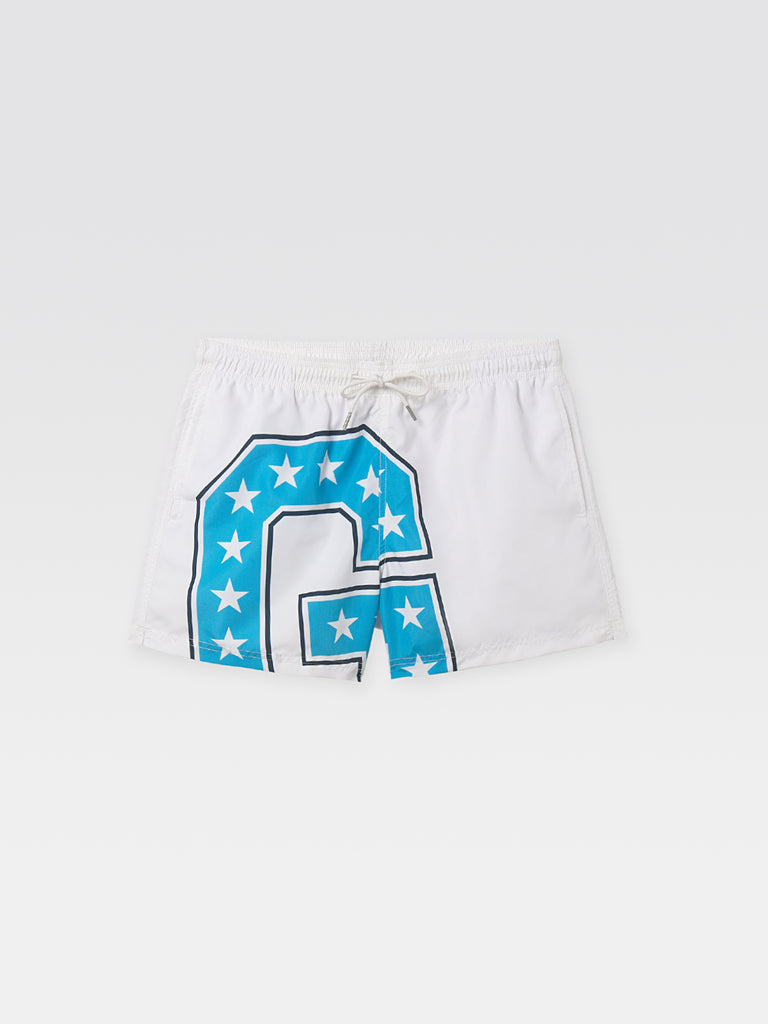 White men's swim shorts featuring a striking oversized G graphic on the front, accented with a star pattern in contrasting blue and black outlines. Designed with an elastic waistband and adjustable drawstring for a personalized fit. Includes functional side pockets and a breathable mesh lining.