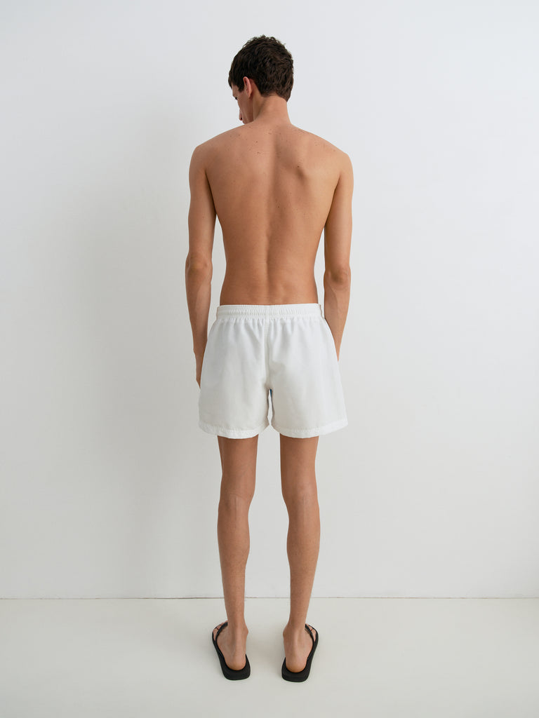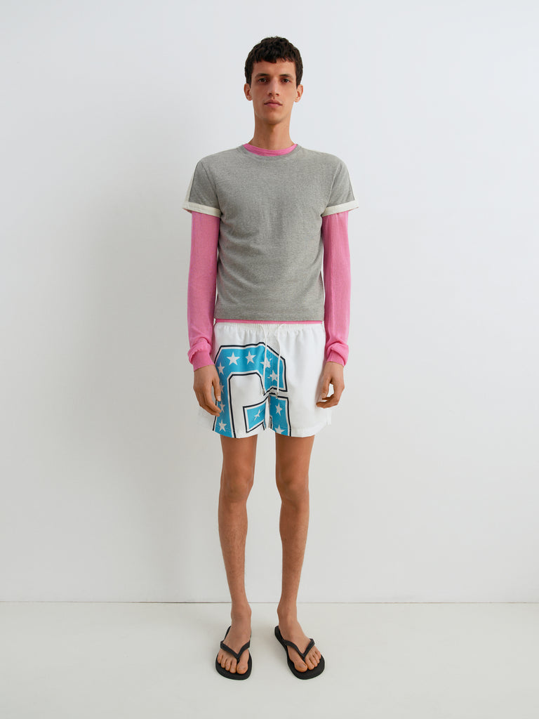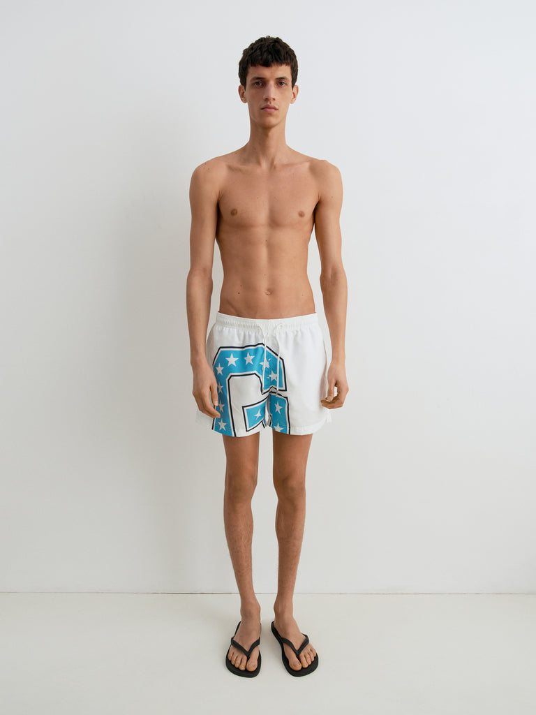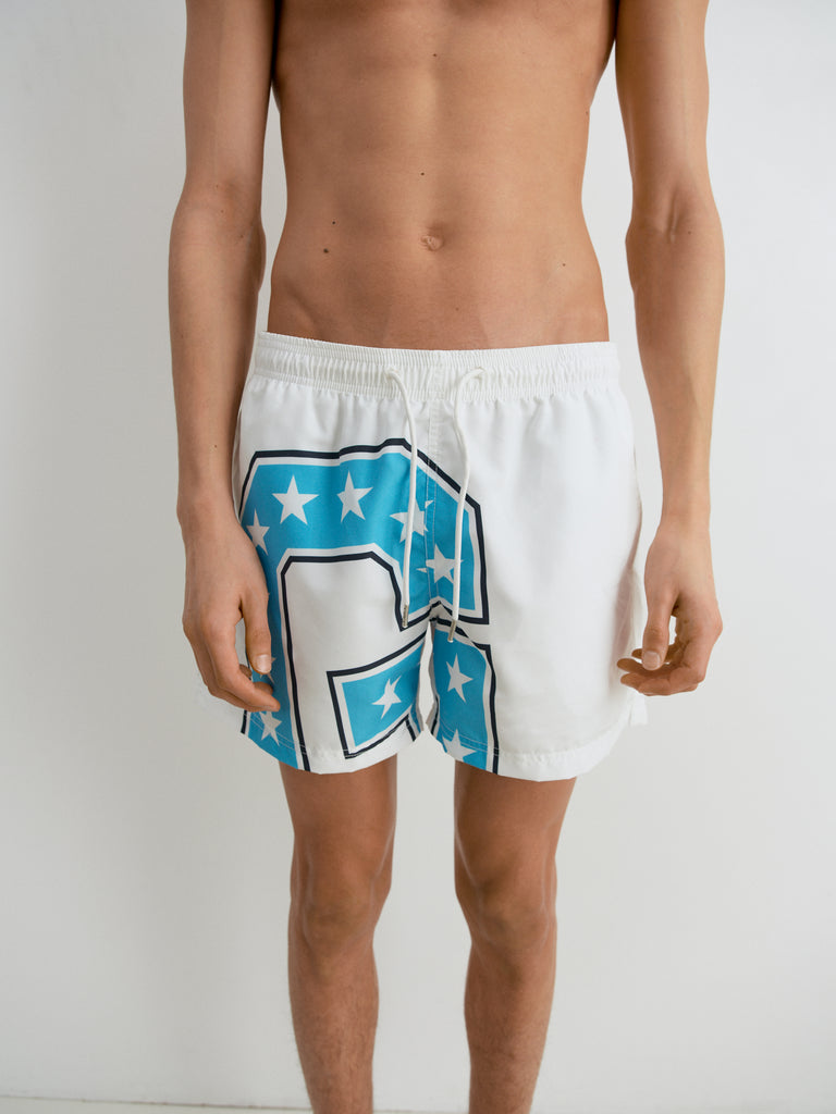 White men's swim shorts featuring a striking oversized G graphic on the front, accented with a star pattern in contrasting blue and black outlines. Designed with an elastic waistband and adjustable drawstring for a personalized fit. Includes functional side pockets and a breathable mesh lining.