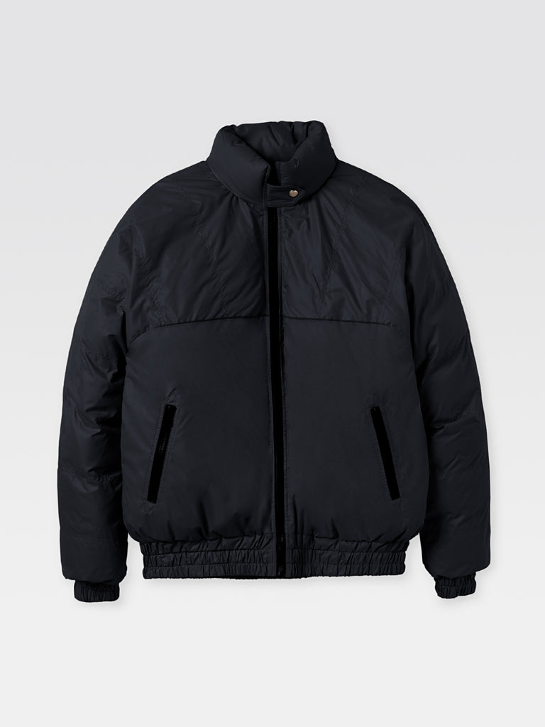Nylon padded jacket in black, closed on front with metallic zipper, featuring padded collar, elastic bottom and elastic cuffs. Embellished with a piping on the chest made from the same fabric. Made by our long collaborator Karuna NGO, Nepal.