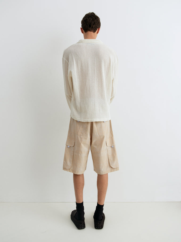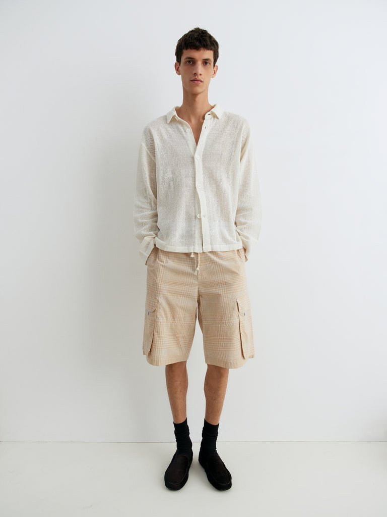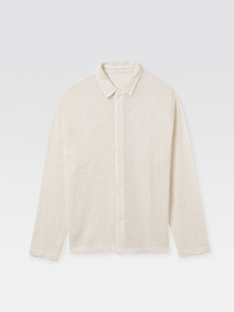 White men's open-knit cotton shirt. Designed with a classic pointed collar and a front button closure. Features long sleeves and a breathable semi-sheer texture, ideal for layering. Finished with a structured fit.