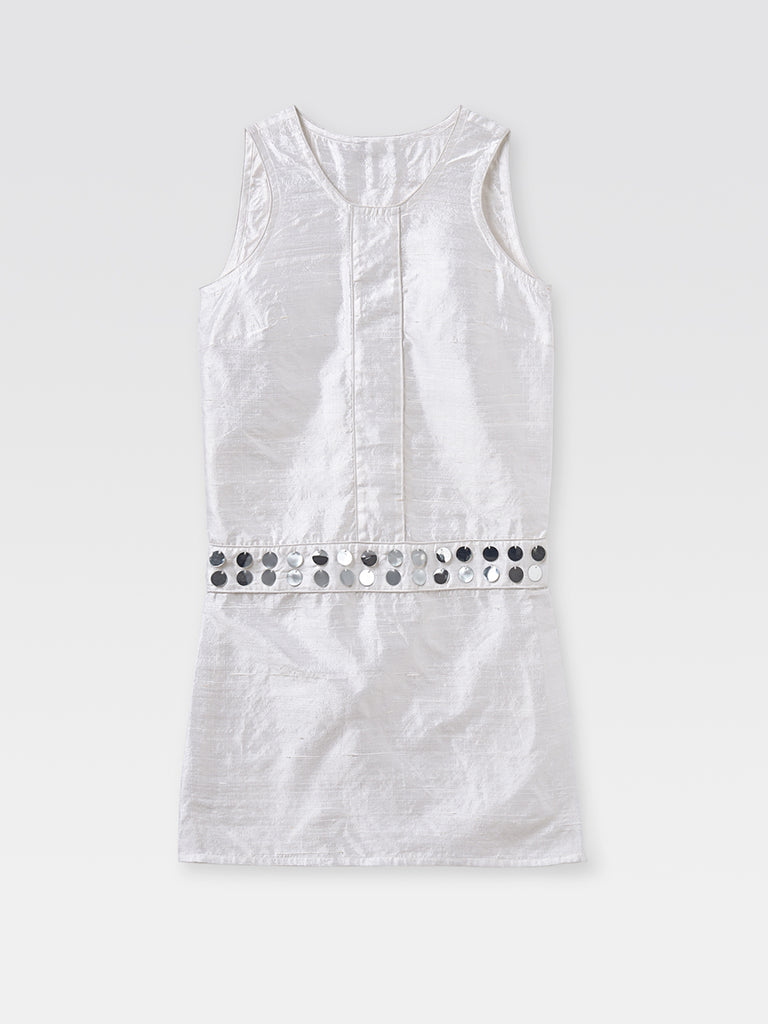 White mini women's dress in textured wild silk. Sleeveless, with a round neckline and rectangular panel construction. Finished with metallic sequin trim at the waist.