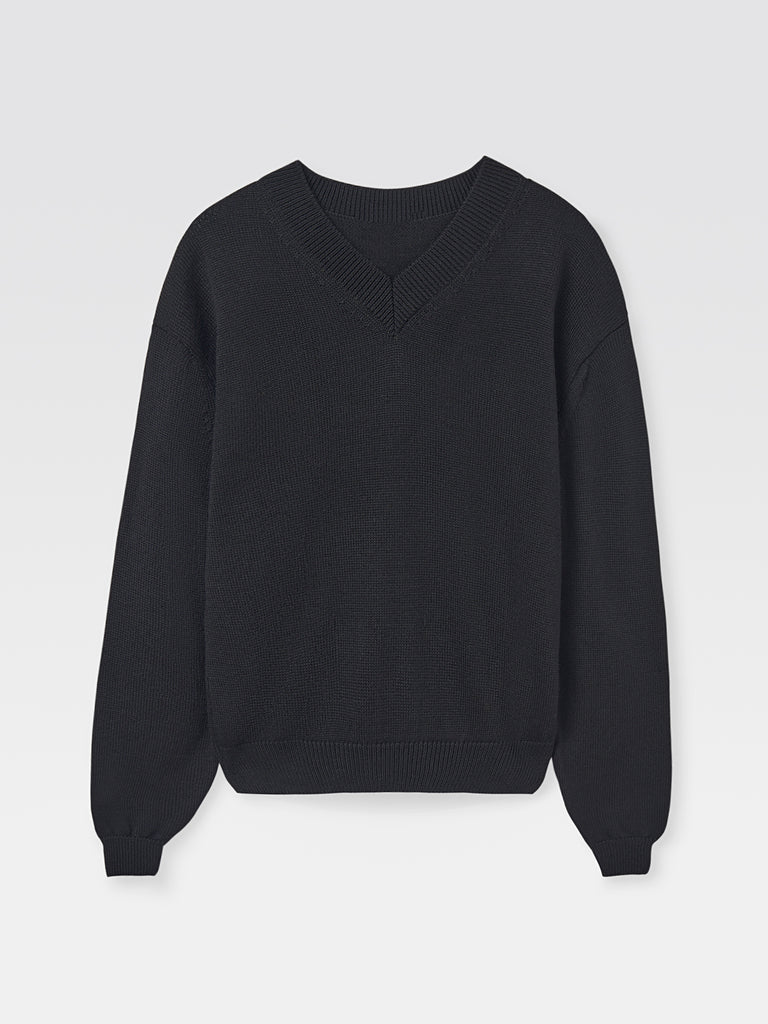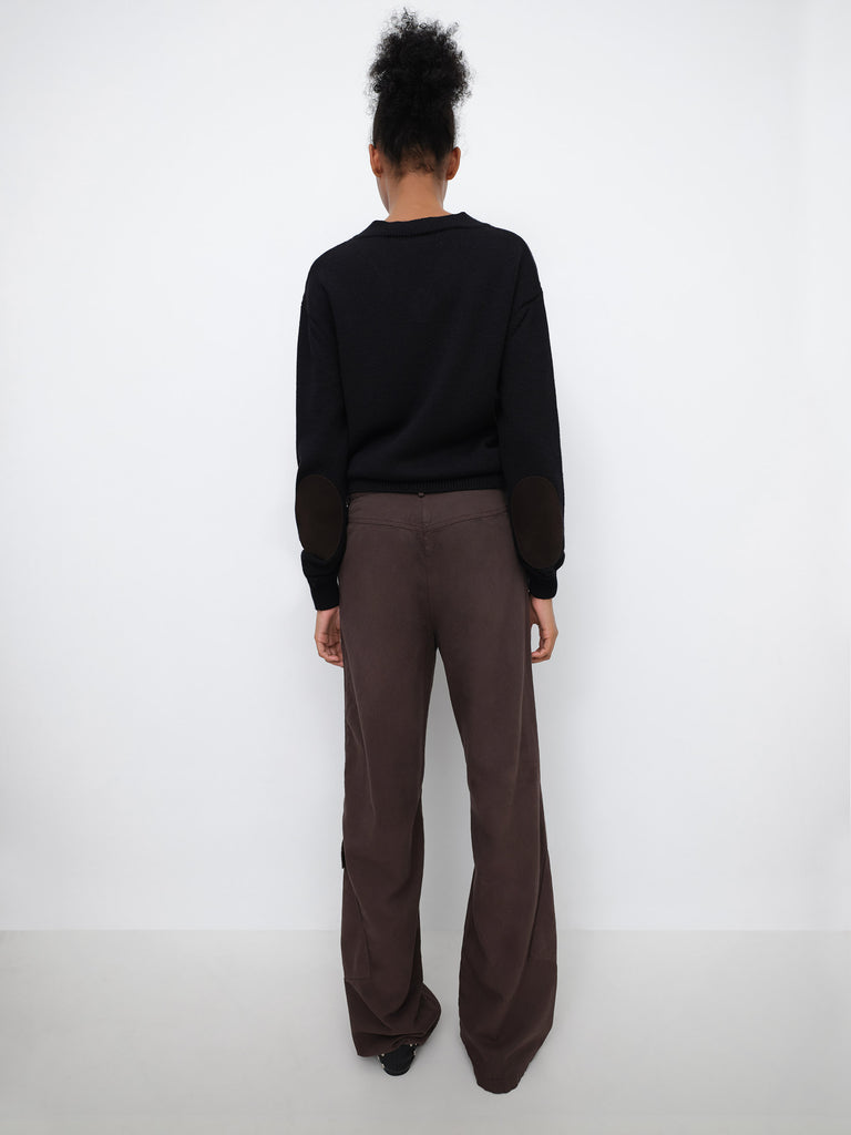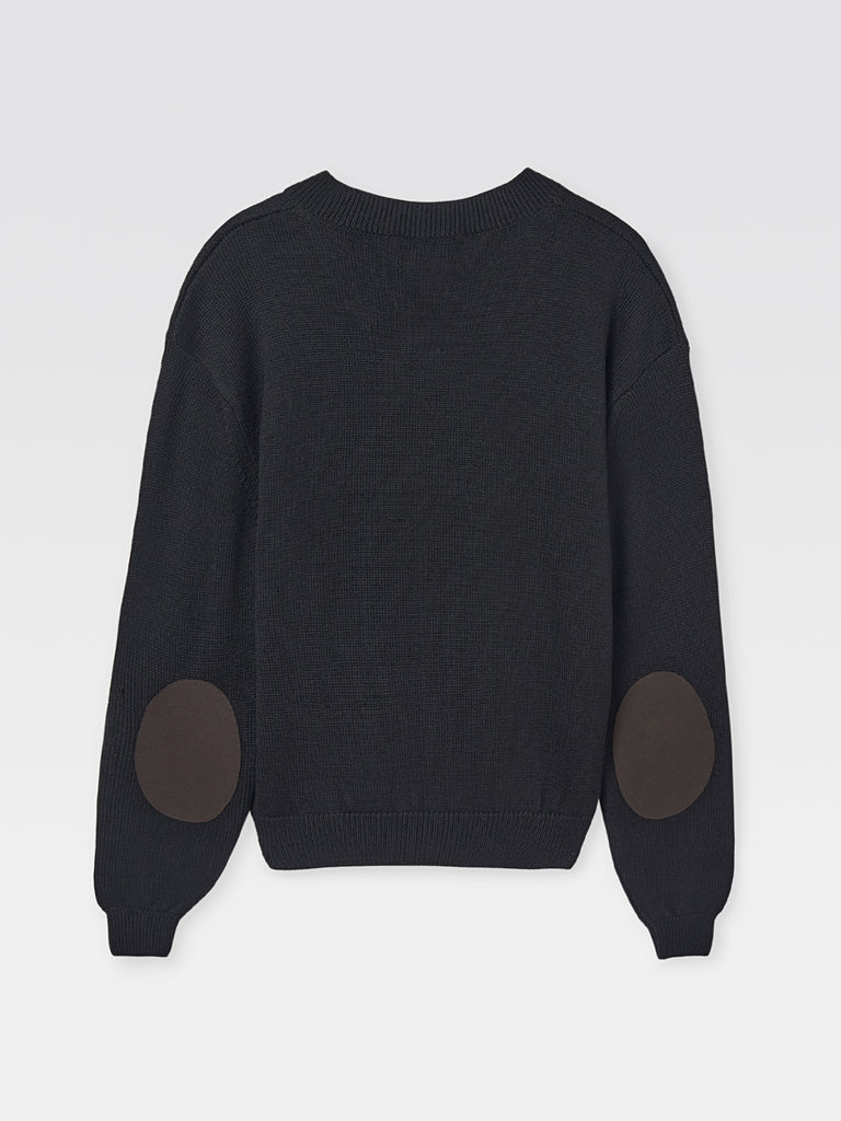 Round-neck sweater in black knit. Long sleeves with brown contrast elbow patches. Ribbed hem, cuffs, and neckline. Straight fit.