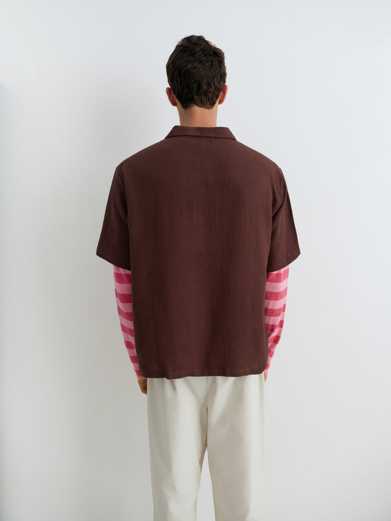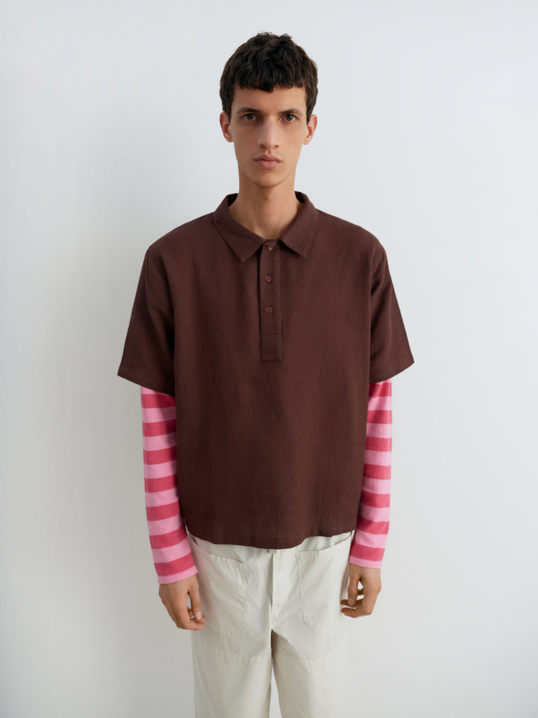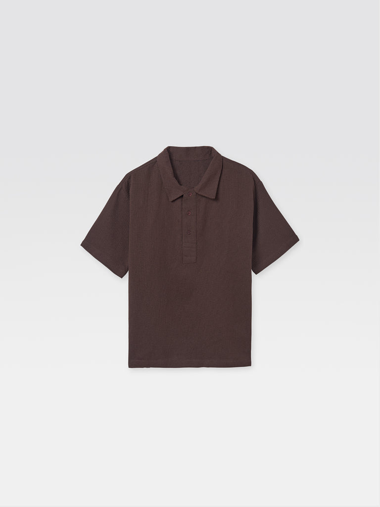 Brown men's textured cotton polo with a relaxed straight fit. Features a structured polo collar with a tonal button placket. Crafted from lightweight, subtly textured fabric for breathability. Finished with short sleeves and a straight hem.