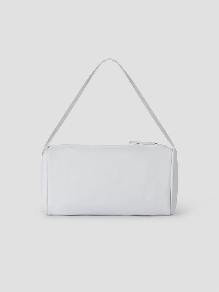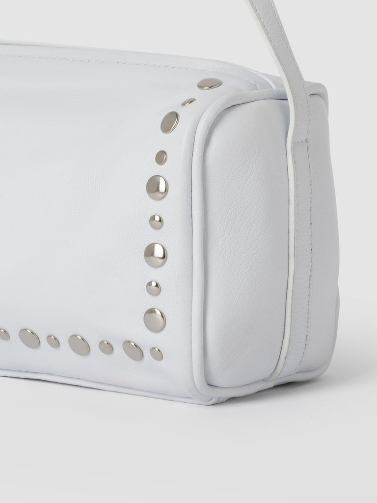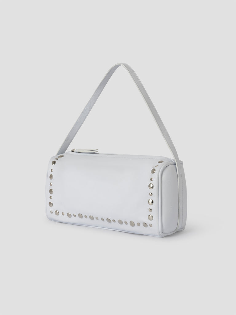 White mini leather baguette bag with silver-tone studs.