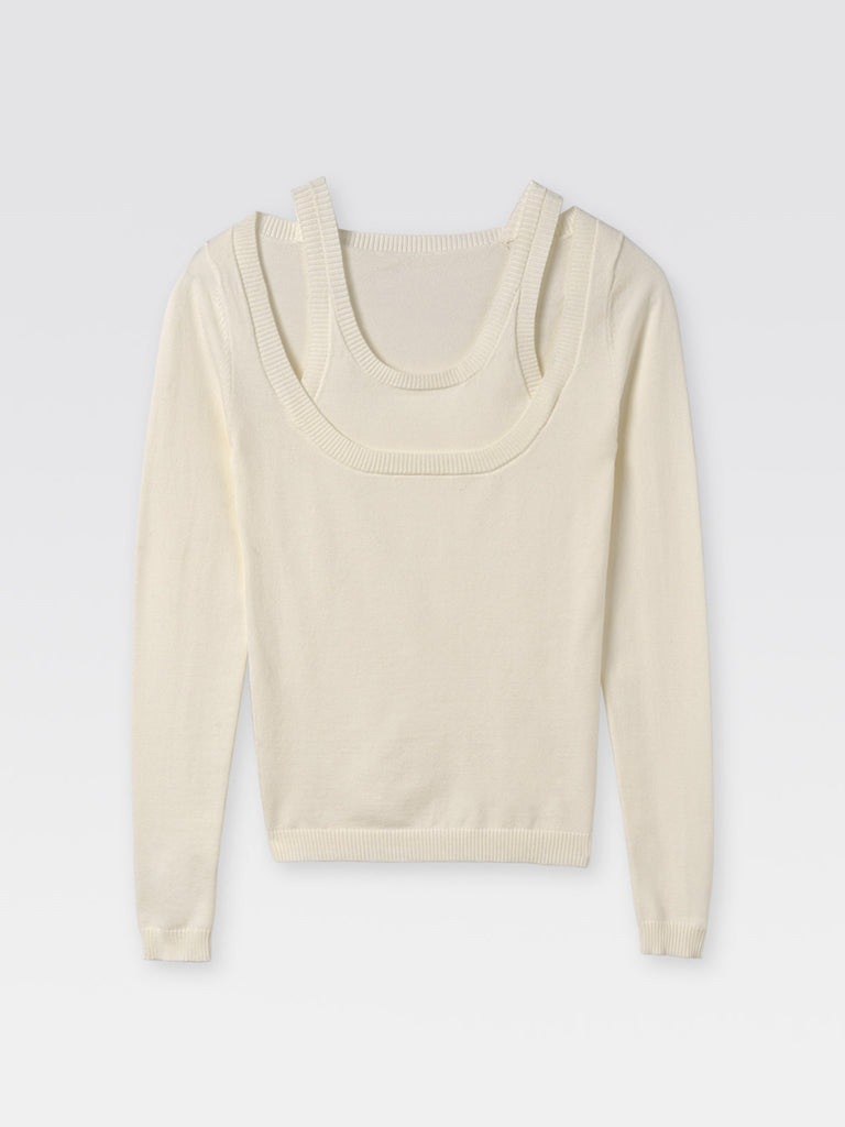 White women's jumper with a fitted silhouette and a double neckline design. Features a scoop neck with delicate straps and an outer layer with long sleeves and a round neckline. Crafted in elastic knit fabric for a comfortable yet structured fit.