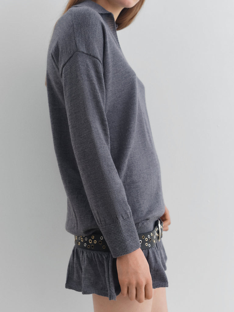Dark grey jumper with ruffled hem and open collar.