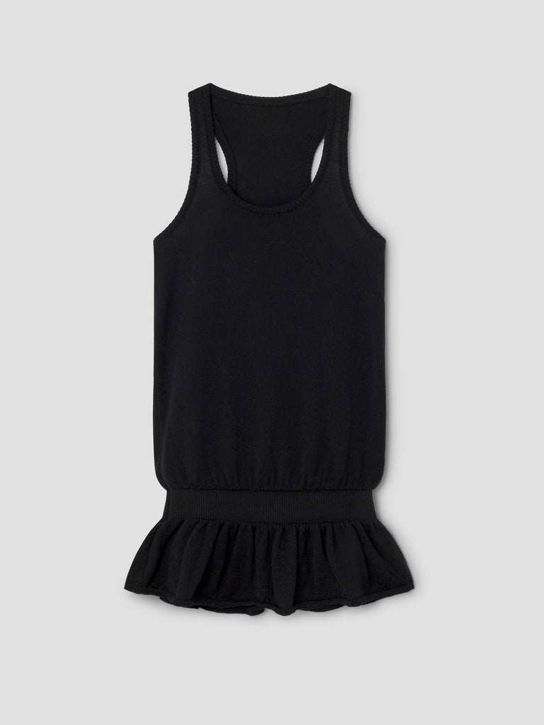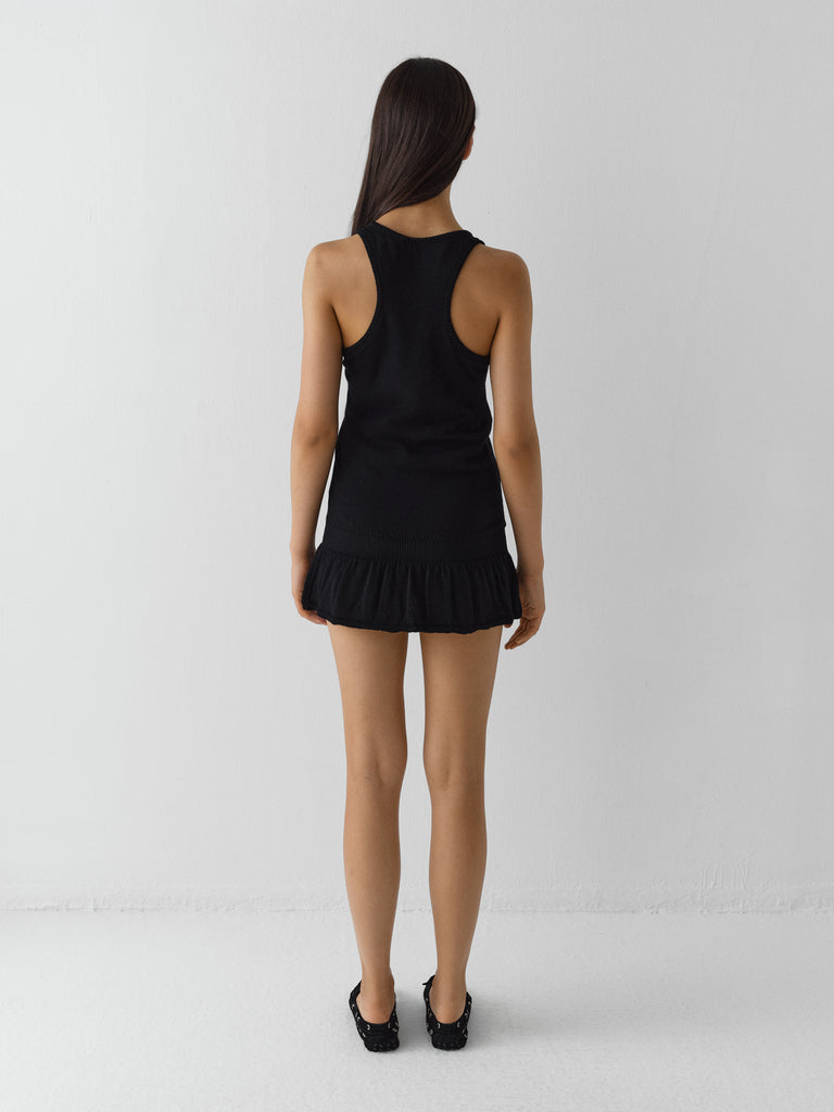Black mini dress with ruffled hem.