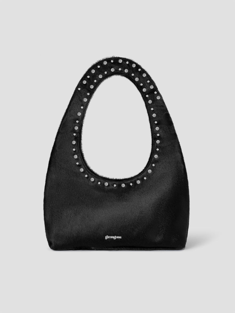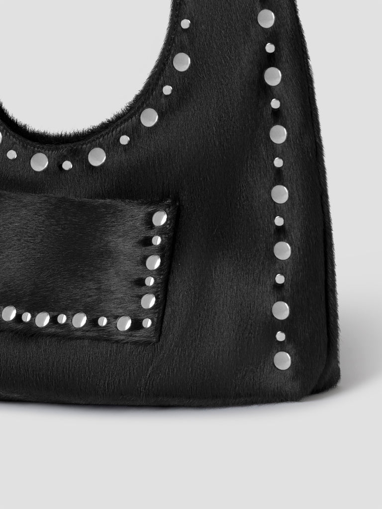 Women's shoulder bag with a flat handle crafted with long hair calfskin in black.