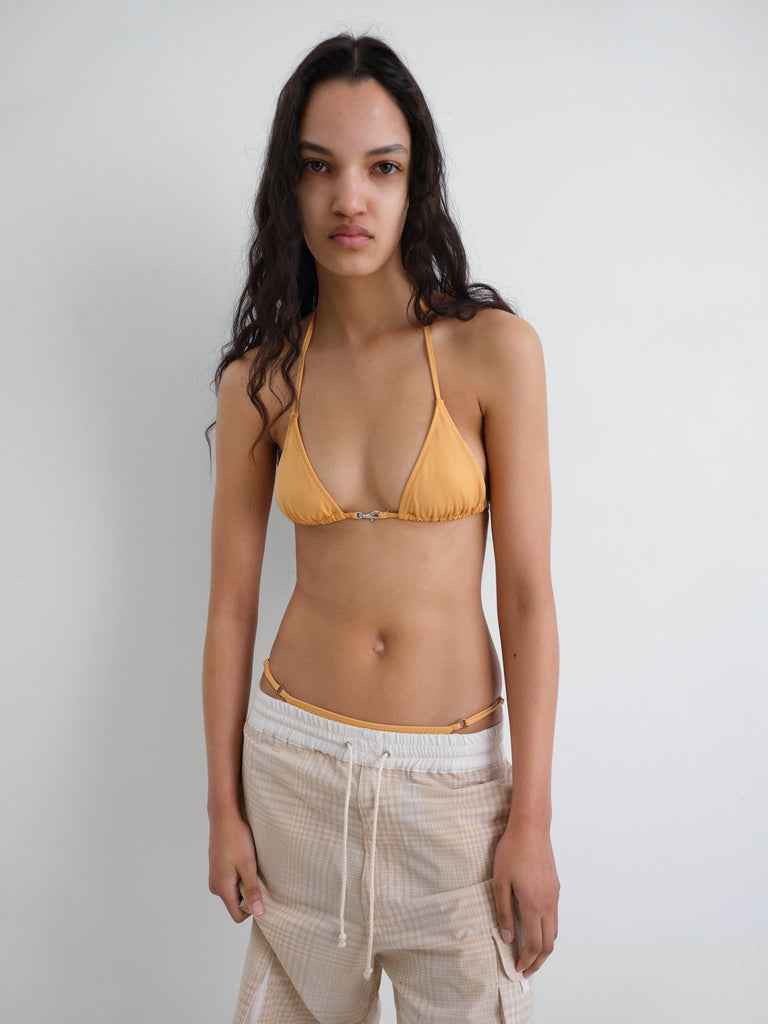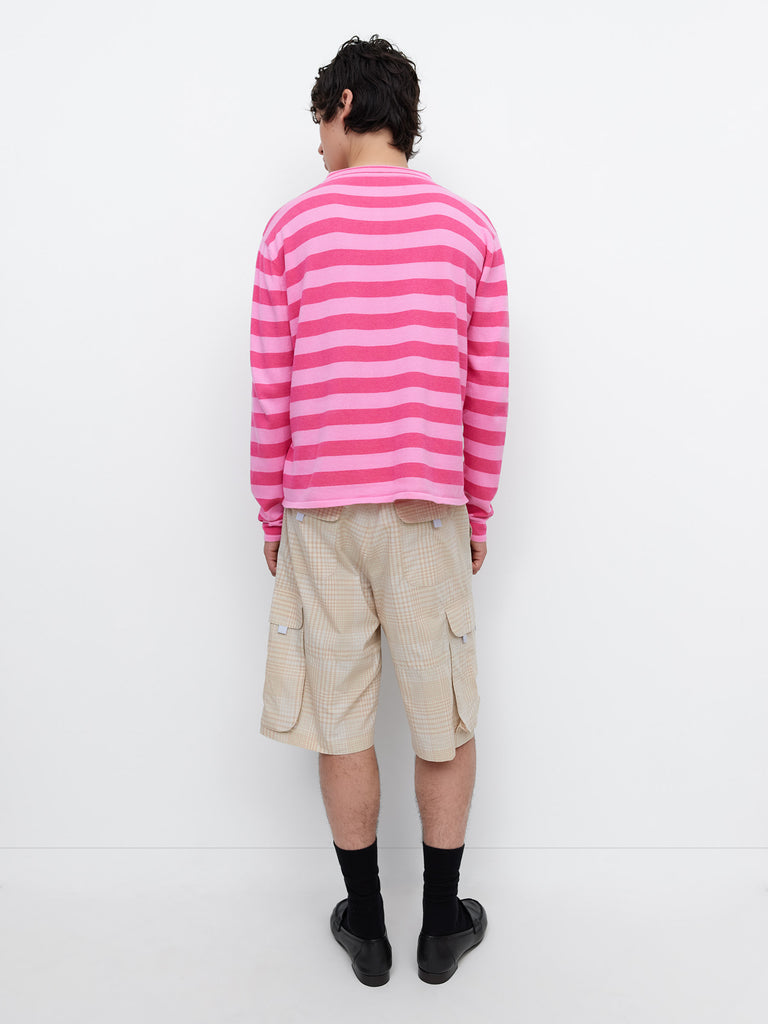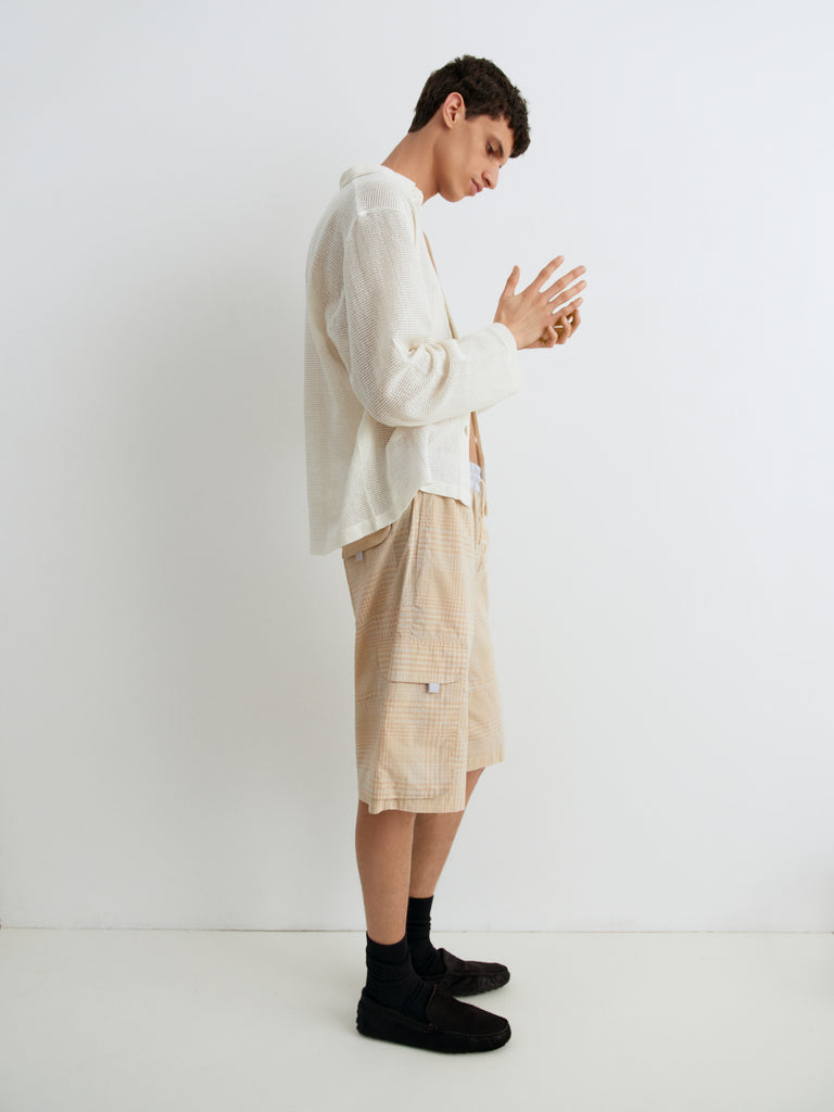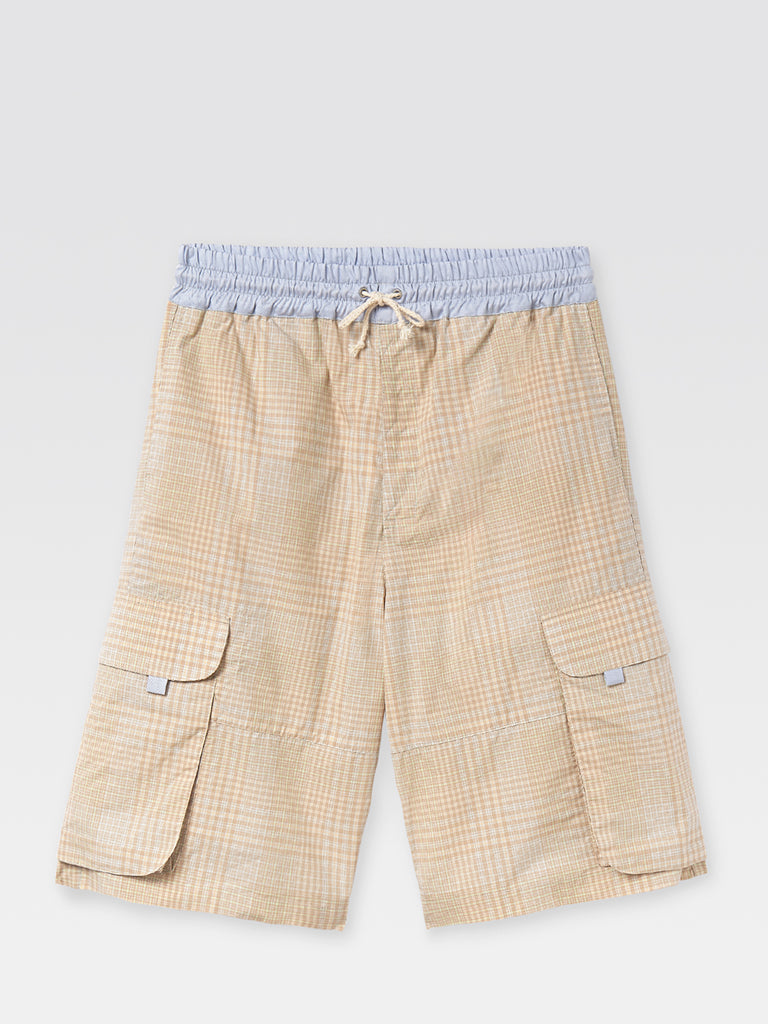 Brown cargo shorts designed for a women and men fit. Knee-length silhouette in lightweight checked cotton. Contrast elastic waistband with an adjustable drawstring. Functional side seam pockets and oversized cargo pockets with flaps.