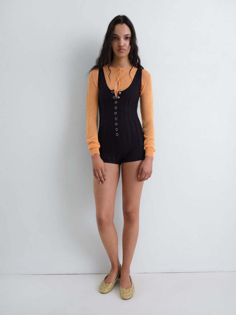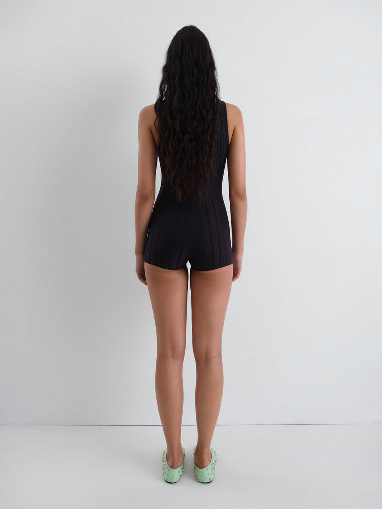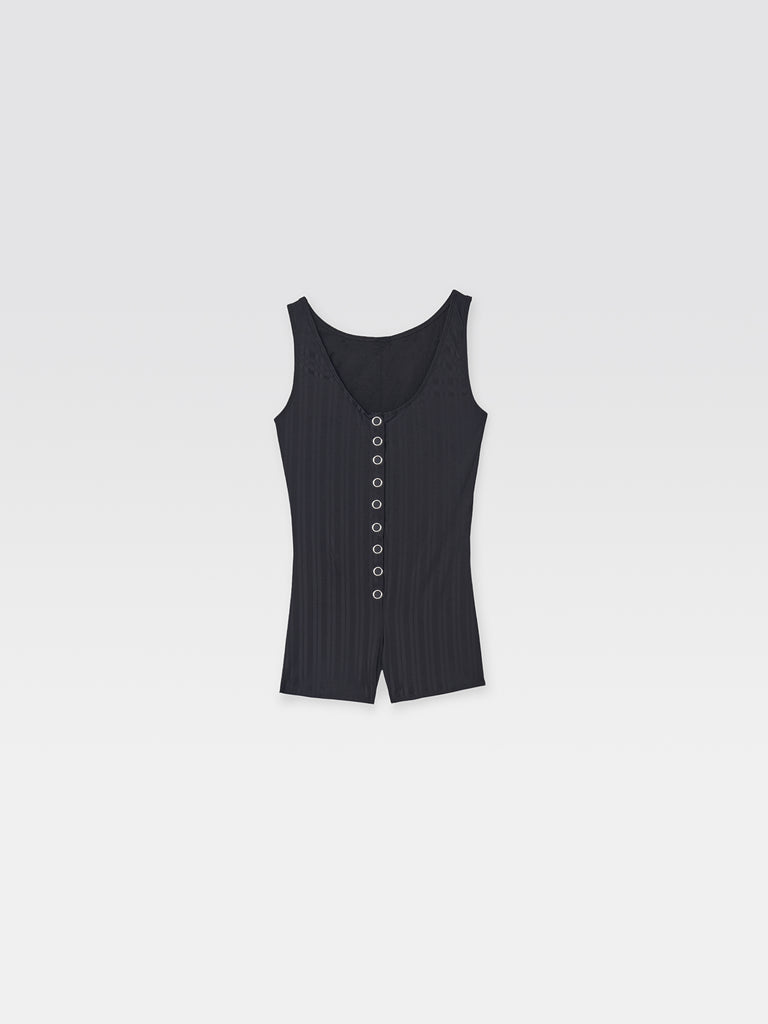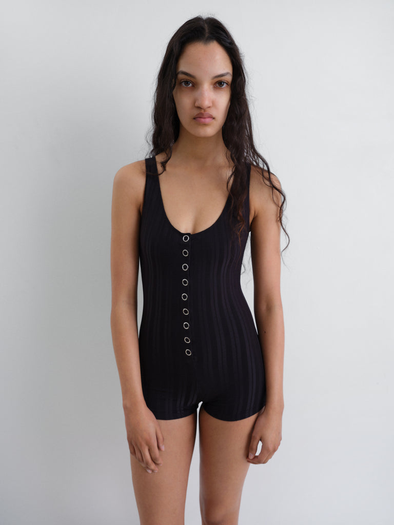 Black women's swimsuit bodysuit with a textured stripe pattern. Designed with a deep scoop neckline and wide shoulder straps. Features a central row of metallic snap buttons for adjustable coverage. A fitted silhouette with a short-length cut.