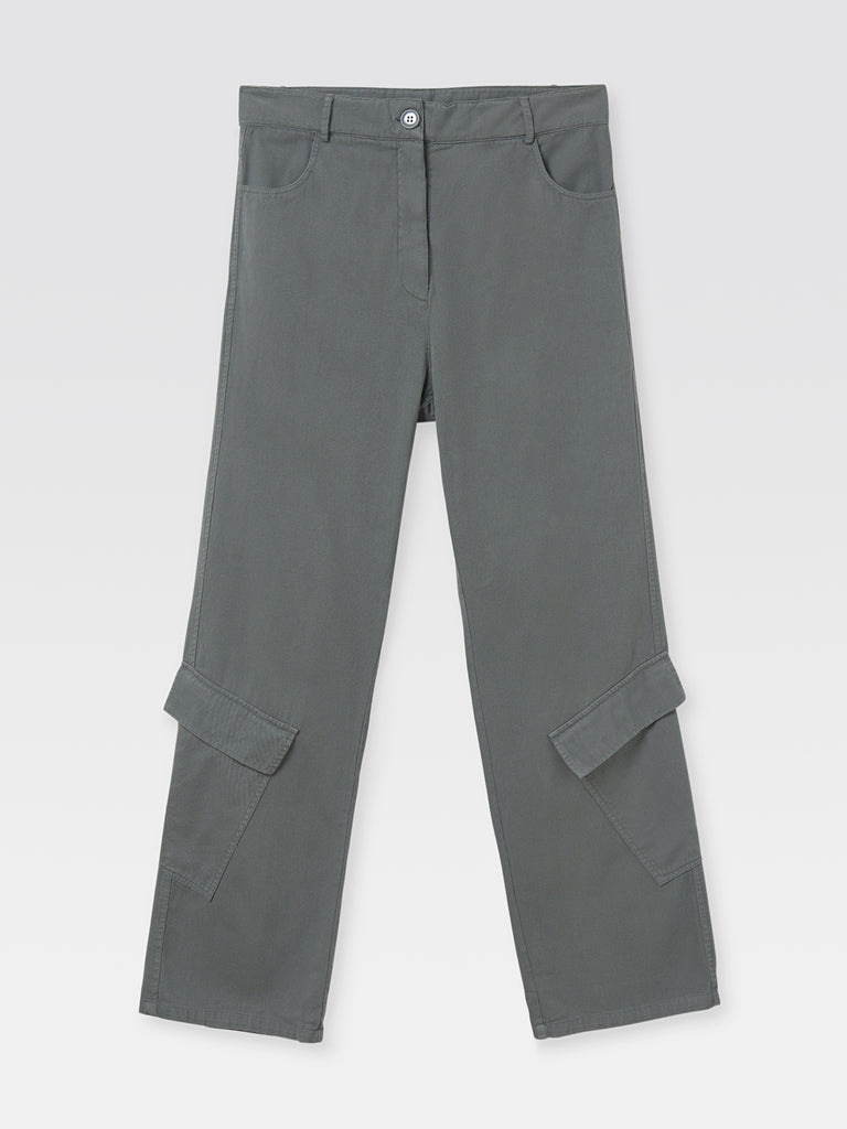 Straight-fit low-waisted grey women's pants featuring crescent pockets on the front waistband and side cargo pockets with flaps. Fastened with a tonal zipper and button.